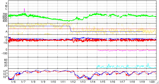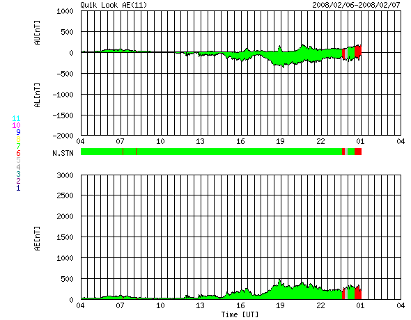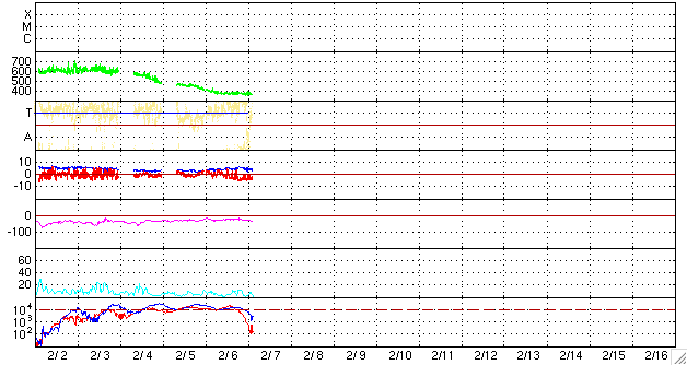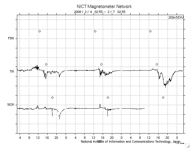ACEが観測した太陽風の磁場(1番上の枠、白線は全体の強度、赤線は南北成分) および、太陽風の密度(3番目の橙線)、速度(4番目の黄線) (c) NOAA/SWPC ![]() リアルタイムAE指数 下段のAEグラフの値が高くなると、オーロラ活動が活発化しています。 (c) 京都大学, NICT ![]() シベリアで観測された3日間の磁場データ 右側の3分の1が、昨日のデータになります。グラフが上がったり下がったりすると、オーロラ活動が活発化しています。 (c) NICT ![]() 27日の太陽周期に合わせたデータプロット 太陽が同じ面を地球に向けていた27日前の変化から、今後を予想することができます。 (c) NICT
