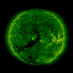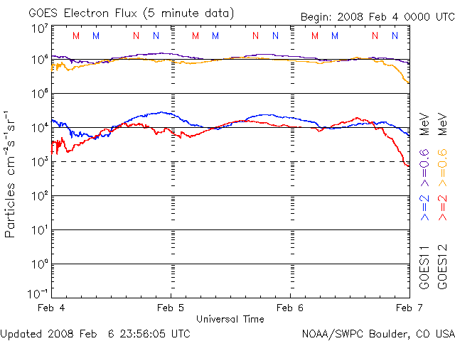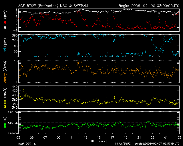 2008/ 2/ 7 11:58 更新 太陽風の速度は下がっていますが(380km/秒)、安定した南向き磁場のため、磁気圏がやや活動的になっています。 担当 篠原 太陽風の速度は、400km/秒から380km/秒にやや下がり、低速風になりつつあります。 磁場強度は、4nTと普通の強さなのですが、 昨夜から半日にわたって、南北成分がいっぱいに南向きになっています。 このため、磁気圏がやや活動的になっています。 南向きの振幅は-4nTと、そこそこ活発なオーロラ活動を起こしそうな強さですが、 速度が下がっているので、あまり大きなエネルギーが磁気圏に流れ込んでいません。 AE指数を見ると300nTくらいの、 比較的小規模の磁気圏活動が起こっている程度です。 この後も、太陽風磁場が南寄りの傾向をとっている間は、 現在の様なやや活動的な状態が続きます。 夕方まで間に合えば、アラスカのライブカメラでオーロラが楽しめるかもしれません。 南向きが終わってしまえば、磁気圏もそこで静かになります。 基本的には、太陽風も磁気圏も、明日までは穏やかに過ぎて行くでしょう。 SOHO EIT195の太陽写真を見てください。 太陽のまん中から東(左)に向かって、濃いコロナホールが伸びています。 ここからの高速風が、明後日、9日くらいからやって来るでしょう。 それとともに、オーロラも活発化します。 磁気圏活動が強まったので、放射線帯の高エネルギー電子が数を減らしています。 一旦、警戒レベルを割ったようです。 ある程度盛り返すと思われますが、警戒レベルまで上がることはないでしょう。 太陽は無黒点で、とても穏やかです。 SOHO衛星のEIT195カメラの映像 (c) SOHO (ESA & NASA)