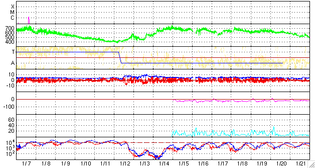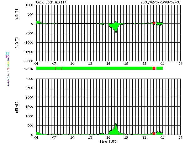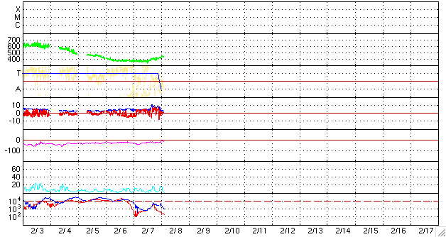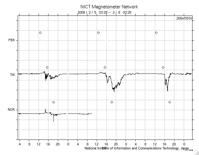 ACEが観測した太陽風の磁場(1番上の枠、白線は全体の強度、赤線は南北成分) および、太陽風の密度(3番目の橙線)、速度(4番目の黄線) (c) NOAA/SWPC ![]() リアルタイムAE指数 下段のAEグラフの値が高くなると、オーロラ活動が活発化しています。 (c) 京都大学, NICT ![]() シベリアで観測された3日間の磁場データ 右側の3分の1が、昨日のデータになります。グラフが上がったり下がったりすると、オーロラ活動が活発化しています。 (c) NICT ![]() 27日の太陽周期に合わせたデータプロット 太陽が同じ面を地球に向けていた27日前の変化から、今後を予想することができます。 (c) NICT