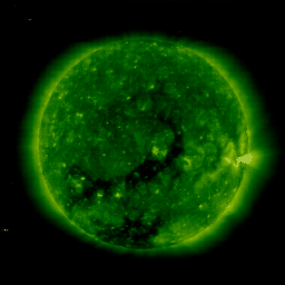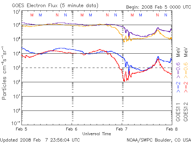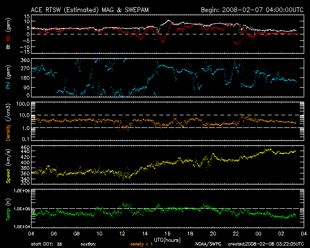 2008/ 2/ 8 12:23 更新 太陽風がやや乱れています。明日くらいから高速太陽風がやって来そうです。 担当 篠原 太陽風がやや乱れています。 磁場強度が一時的に10nT近くまで上がり、速度も440km/秒へ上がりました。 磁場強度は既に2nTまで弱まっていますが、速度はまだ上がったままです。 次の高速風の到来にはまだ早そうですし、 磁場強度がもう弱まっていることから、一時的な乱れではないかと思います。 27日周期の図を見ると、この頃にセクターの境界がやって来ています。 この構造の変化と関連した乱れだったのかもしれません。 この太陽風の変化で、AE指数で600nTの中規模の変化が1回だけ起こっています。 その前後は全く静穏です。 太陽風は、特にこれ以上乱れが大きくなることはなく、 このまま明日くらいに高速風の本番を迎えることになるのではないでしょうか。 SOHO EIT195の太陽写真では、コロナホールが次第に西半球へ移動しています。 この暗い影が太陽の西側のまん中あたりに達すると、高速風が地球へやってきます。 これは、あくまでも目安の位置で、 地球へやって来る高速風自体は、コロナホールが太陽の中心にあるときに、 地球へ向かって吹き出していたものです 高速風の始まりでは、磁場強度が先に強まります。 その時に、磁場の南向きが強まると、活発なオーロラ活動を作ります。 明日以降は、ライブカメラにも注目してみて下さい。 たいした規模ではありませんでしたが、一昨日、昨日と磁気圏の活動が見られました。 その影響で、放射線帯の高エネルギー電子はどんどん数を減らしています。 次の高速風が来ると、再び増加を始めますので、 明後日くらいから、また注意が必要になるでしょう。 太陽は黒点はなく、とても穏やかです。 SOHO衛星のEIT195カメラの映像 (c) SOHO (ESA & NASA)