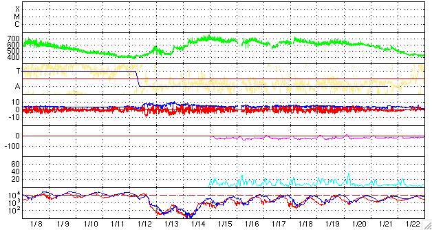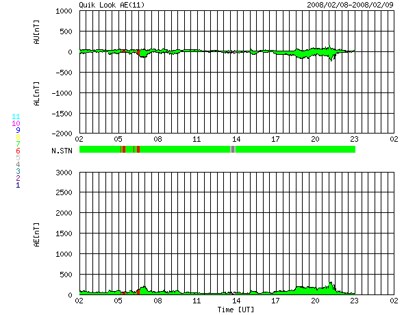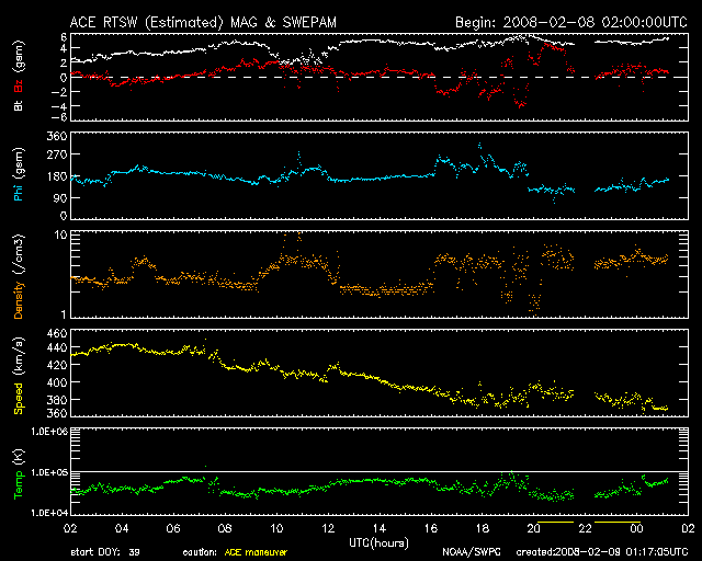 2008/ 2/ 9 10:17 更新 太陽風は速度380km/秒で穏やかです。これから高速太陽風がやってきます。 担当 篠原 もうすぐ、高速の太陽風が地球にやって来ます。 その発生源であるコロナホールが、太陽の中心に大きく広がっています。 今日はちょっと気分を変えて、ひとつ大きなサイズのEIT195写真を掲載しましょう。 こちらのサイズにすると、コロナホールの迫力が一段と増します。 赤道から南側に寄って、緩いカーブを描きながらコロナホールが広がっています。 今、ここから地球に向かって、速度の高い太陽風が噴き出しているのです。 コロナホールの先頭(右端)が、太陽の中心線と西の端の中間くらいに達しています。 この辺りが、高速風の開始を知る目安の位置です。 高速風の先頭が、そろそろ地球へ達する頃です。 このコロナホールは東西に長く伸びているので、 地球に高速風がやってくる期間も長くなります。 前周期は9日間にわたって500km/秒を超える風が続きました。 今周期も元気よく風がやってきそうです。 SOHOの写真では、南極(下の端)にも大きなコロナホールが見えています。 ここからも高速の太陽風が噴き出していますが、 噴き出す方向が地球から大きくずれていますので、私たちに影響はありません。 現在の太陽風は、速度380km/秒、磁場強度5nTと通常の状態です。 まだ、高速風到来の気配は見えていません。 この後、密度(ACEの橙色線)の増加、磁場強度(白線)の増加などが見られるはずです。 それに続いて、速度(黄色線)の上昇が始まります。 高速風の前半は、オーロラが強まる可能性が大きいのも特徴です。 この連休は、ライブカメラにも目を向けてください。 現在の磁気圏はとても穏やかです。 放射線帯は、現在は1,000のレベルです。 高速風の到来後は、変化に注意してください。 太陽は黒点は見られず、とても穏やかです。 SOHO EIT195による、太陽コロナの様子。中央部にコロナホールが複雑に広がっています。 (c) SOHO (ESA & NASA) ![]() ACEが観測した太陽風の磁場(1番上の枠、白線は全体の強度、赤線は南北成分) および、太陽風の密度(3番目の橙線)、速度(4番目の黄線) (c) NOAA/SWPC ![]() リアルタイムAE指数 下段のAEグラフの値が高くなると、オーロラ活動が活発化しています。 (c) 京都大学, NICT ![]() シベリアで観測された3日間の磁場データ 右側の3分の1が、昨日のデータになります。グラフが上がったり下がったりすると、オーロラ活動が活発化しています。 (c) NICT ![]() 27日の太陽周期に合わせたデータプロット 太陽が同じ面を地球に向けていた27日前の変化から、今後を予想することができます。 (c) NICT