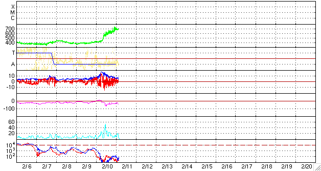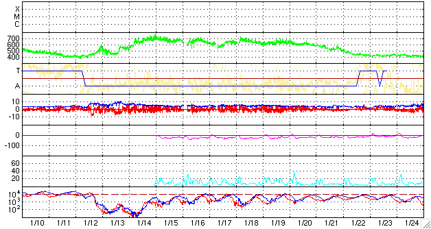 ACEが観測した太陽風の磁場(1番上の枠、白線は全体の強度、赤線は南北成分) および、太陽風の密度(3番目の橙線)、速度(4番目の黄線) (c) NOAA/SWPC ![]() リアルタイムAE指数 下段のAEグラフの値が高くなると、オーロラ活動が活発化しています。 (c) 京都大学, NICT ![]() シベリアで観測された3日間の磁場データ 右側の3分の1が、昨日のデータになります。グラフが上がったり下がったりすると、オーロラ活動が活発化しています。 (c) NICT ![]() 27日の太陽周期に合わせたデータプロット 太陽が同じ面を地球に向けていた27日前の変化から、今後を予想することができます。 (c) NICT
