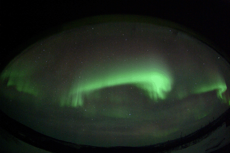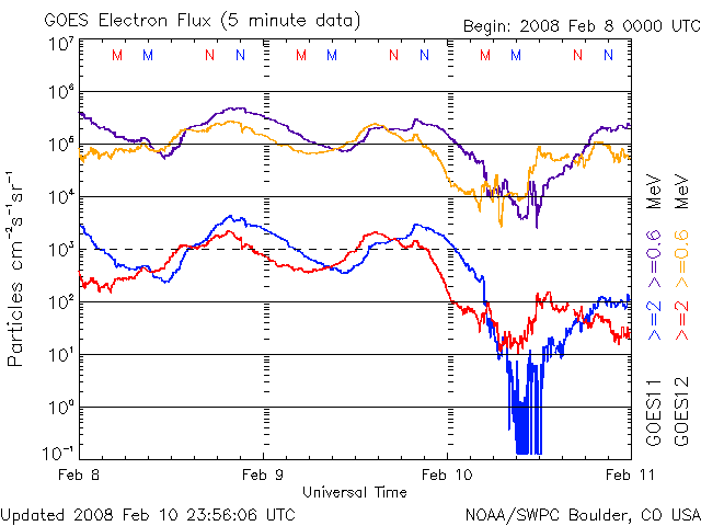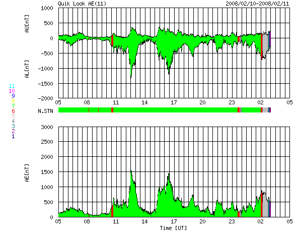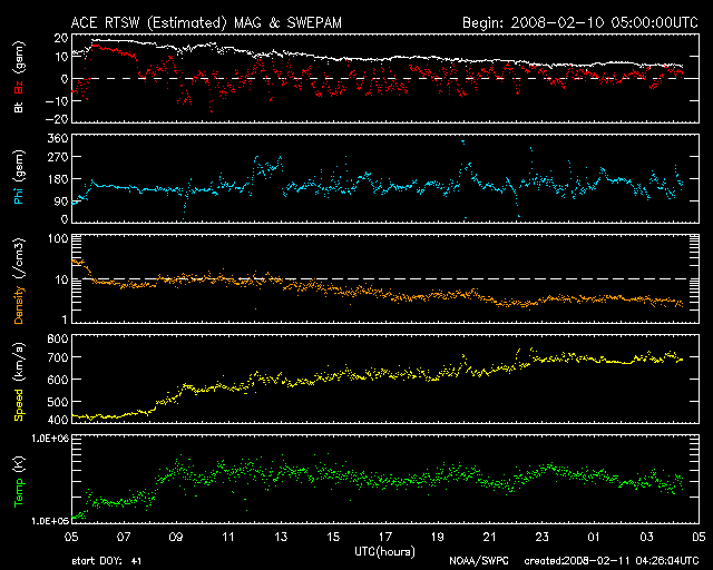 2008/ 2/11 13:27 更新 700km/秒の高速太陽風になっています。激しいオーロラ活動が発生しています。 担当 篠原 昨日の夕方から、太陽風の速度が上昇を始め、 現在700km/秒のかなり速い高速風になっています。 ACE衛星の観測によると、速度の変化は10日17時(世界時10日8時)頃に始まりました。 2時間ほどで600km/秒近くまで上がり、 その後は半日ほどかけてゆっくりと700km/秒まで上がっています。 700km/秒に達したのは、今朝、11日8時(世界時10日23時)頃です。 高速風の始まりとともに、磁気圏のオーロラ活動がかなり激しくなりました。 AE指数を見ると、最大1500nTに達する大規模な変動が、2度にわたって起きています。 このうちの、最初の活動がアラスカのライブカメラで撮影されています。 今日の図の1枚めに、動画を掲載します。 少し長めに作ったので、ファイルサイズが大きくなっています。 昨夜の北極域では、とてもきれいなオーロラを楽しむことができたようです。 また、シベリア磁場データでは、AE指数の2つめの激しい変化がとらえられています。 グラフに見られる急峻な磁場の減少は、 観測点の上空でオーロラ電流の激しい増加が起こったことを示しています。 激しい磁気圏活動をもたらした高速太陽風ですが、 速度はこの後も高い状態が続くでしょう。 前周期の変化から予想すると、2月17日くらいまで、1週間は続きそうです。 SOHO EIT195では、コロナホールの後半部がちょうど太陽の中心に見えているところです。 まだまだ高速風が地球に向かって吹き出しています。 オーロラ活動も引き続き活発に見られるでしょう。 太陽風の磁場強度が10nTから5nTへと下がって来たため、 昨夜の様な、激しい変化は起こりにくくなりますが、 中規模の活動はこの後も続くでしょう。 放射線帯の高エネルギー電子は、数を大きく減らしています。 この後、増加を始めますから、どこまで上がるか注意が必要です。 太陽は無黒点です。 こちらは、非常に静穏です。 アラスカのライブカメラによる、10日19〜23時(現地10日1〜5時、世界時10日10〜14時)のオーロラの様子。 (c) NICT/SALMON ![]() SOHO衛星のEIT195カメラの映像 (c) SOHO (ESA & NASA)