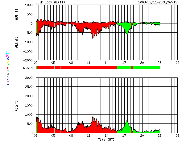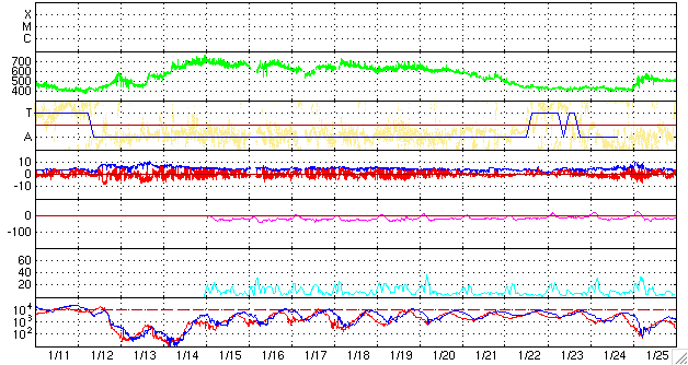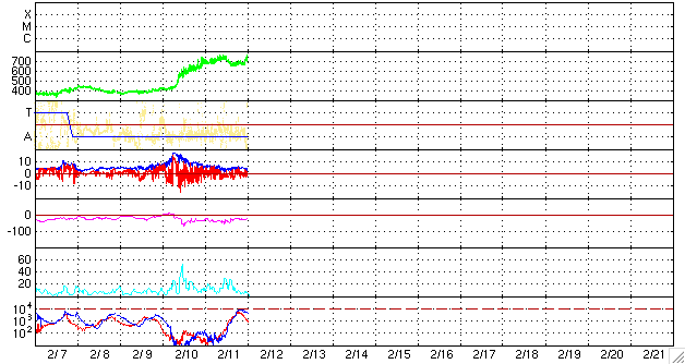 ACEが観測した太陽風の磁場(1番上の枠、白線は全体の強度、赤線は南北成分) および、太陽風の密度(3番目の橙線)、速度(4番目の黄線) (c) NOAA/SWPC ![]() リアルタイムAE指数 下段のAEグラフの値が高くなると、オーロラ活動が活発化しています。 (c) 京都大学, NICT ![]() シベリアで観測された3日間の磁場データ 右側の3分の1が、昨日のデータになります。グラフが上がったり下がったりすると、オーロラ活動が活発化しています。 (c) NICT ![]() 27日の太陽周期に合わせたデータプロット 太陽が同じ面を地球に向けていた27日前の変化から、今後を予想することができます。 (c) NICT