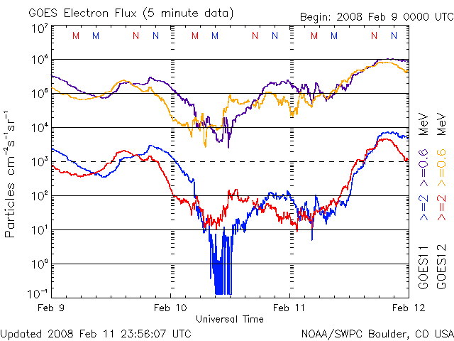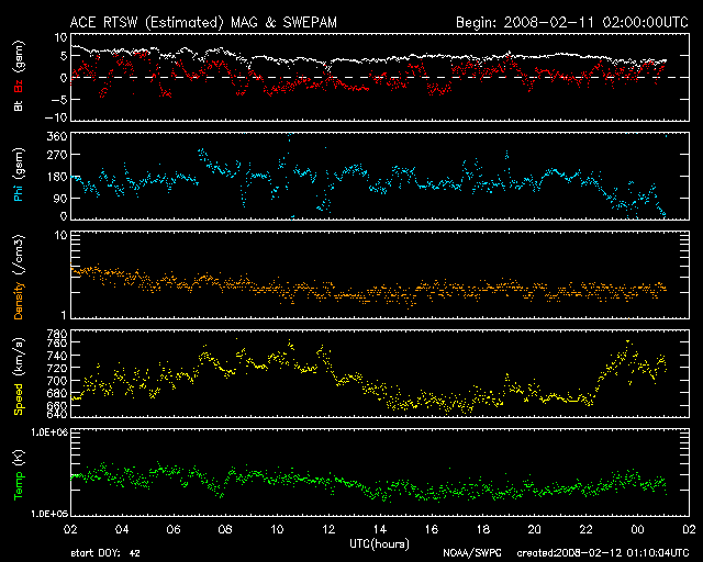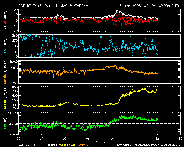2008/ 2/12 10:11 更新 700km/秒の高速太陽風が続いています。オーロラ活動も活発に続いています。 担当 篠原 今日の1枚めの図は、1週間の太陽風のグラフです。 10日に始まった高速太陽風の、立ち上がりの様子がよく分かります。 速度(黄色線)の上昇は、世界時で10日に入ってしばらくたって始まりました。 一方、磁場強度(白線)と、プラズマ密度(橙色線)の上昇は、 速度よりも半日ほど早く、9日のうちに始まっています。 速度の高い太陽風に押し込まれた様な姿です。 コロナホールによる高速風が来る時は、時間的にこの様な変化が見られます。 磁場の南北成分(赤線)を見ると、 磁場強度が強まるとともに、大きく南北に振動していることが分かります。 頻繁に南向きが現れたため、磁気圏に大きなエネルギーが流れ込み、 一昨日、昨日と活発なオーロラ活動を引き起こしているのです。 現在の太陽風は、速度が700km/秒前後でたいへん高い速度を保っています。 最大で740km/秒まで上がっています。 磁場強度は5nTと、普通の強さです。 初めに書いた様に、南向き磁場が頻繁に起こっていて、磁気圏を刺激し続けています。 AE指数を見ると、500〜1000nTの中規模活動が大きく4回ほど発生しています。 磁気圏は活発な状態が続いています。 アラスカのライブカメラでも、きれいなオーロラの活動を見ることができました。 高速風が続いていますので、まだまだ活発なオーロラは続くでしょう。 今後の高速風ですが、 SOHO EIT195の太陽コロナ写真で、コロナホールの様子を27日前の写真と比べて下さい。 左が現在、右が27日前です。 ほとんど同じ分布をしています。 このため、今後の太陽風の変化も、前周期と同じ様な展開になりそうです。 そう見ると、2月17-18日まで、まだたっぷりと高速風が続きそうです。 放射線帯高エネルギー電子が、一気に増加しています。 青線のGOES11が、警戒ラインまであと一歩のところまで上がっています。 この後も増加して、警戒レベルに達することになるでしょう。 衛星の運用では、しばらく注意が必要になります。 太陽は無黒点で、とても穏やかです。 ACE衛星による、7日間の太陽風の変化。10日より高速の太陽風が始まっている。速度は黄色線、磁場強度は白線。 (c) NOAA/SWPC ![]() SOHO衛星のEIT195カメラの映像 (c) SOHO (ESA & NASA)