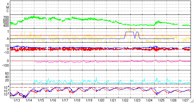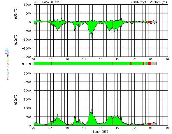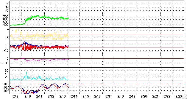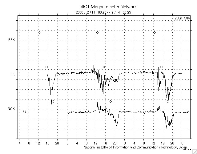 ACEが観測した太陽風の磁場(1番上の枠、白線は全体の強度、赤線は南北成分) および、太陽風の密度(3番目の橙線)、速度(4番目の黄線) (c) NOAA/SWPC ![]() リアルタイムAE指数 下段のAEグラフの値が高くなると、オーロラ活動が活発化しています。 (c) 京都大学, NICT ![]() シベリアで観測された3日間の磁場データ 右側の3分の1が、昨日のデータになります。グラフが上がったり下がったりすると、オーロラ活動が活発化しています。 (c) NICT ![]() 27日の太陽周期に合わせたデータプロット 太陽が同じ面を地球に向けていた27日前の変化から、今後を予想することができます。 (c) NICT