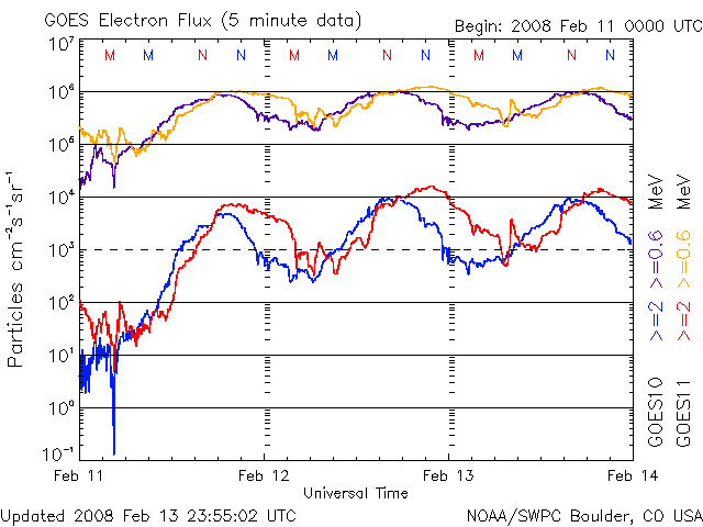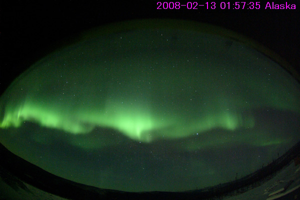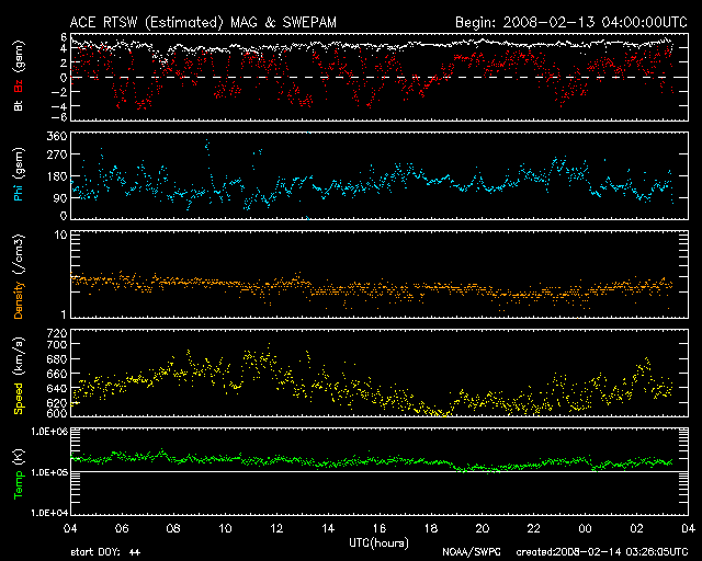 2008/ 2/14 12:27 更新 高速太陽風領域は、折り返しを迎えたころです。600km/秒台の高速風が続き、オーロラも活発に発生しています。 担当 篠原 安定した高速太陽風が続いています。 昨日より、太陽風の速度(ACEの黄色線)は、600〜660km/秒の間をゆっくりと変化していて、 たいへん高速のままです。 磁場強度(白線)も5nTを保っています。 これは普通の強さですが、 高速風が終わりに近づくと、初めに磁場強度が弱まる傾向があります。 このため、磁場強度の変化は、今後の高速風の予測に役立つのです。 現在は、磁場強度は弱まっていませんから、まだまだ高速風が続きそうです。 実際、27日周期の図を見ると、高速風の領域はちょうど折り返しを迎えたところです。 この後も、4日程度、乱れた太陽風が続くでしょう。 高い速度の太陽風が続くとともに、 太陽風磁場の南北成分(ACEの赤線)が南北(マイナス、プラス)に振れています。 南向きが頻繁に起こると、オーロラ活動を強く刺激します。 AE指数を見ると、500nTから800nTくらいの中規模活動が3時間おきに発生しています。 北極域の空は、オーロラできれいに彩られていたことでしょう。 アラスカのライブカメラで撮れていた、昨夜のベストショットを、 少し大きめの写真で掲載します。 きれいなカーテン状のオーロラが、夜空を東西に横切ってたなびいています。 今夜もオーロラ観望のチャンスは続きます。 こうやってライブカメラを楽しめるのも、来月いっぱいくらいでしょうから、 シーズン終盤のオーロラを、たっぷりと楽しんでください。 放射線帯の高エネルギー電子は、警戒レベルに達していますが、それ以上の増加はしていません。 このまま、警戒状態が1週間程度続くことになりそうです。 太陽は無黒点で、とても静穏です。 SOHO EIT195の太陽コロナ写真は、南半球にコロナホール(より暗い部分)が見えているだけで、 明るく光っている部分は全くありません。 黒点のような、活動的な領域がほとんど見られない太陽です。 アラスカのオーロラライブカメラで撮影された、13日20時(現地13日2時、世界時13日11時)のオーロラ。 (c) NICT/SALMON ![]() SOHO衛星のEIT195カメラの映像 (c) SOHO (ESA & NASA)