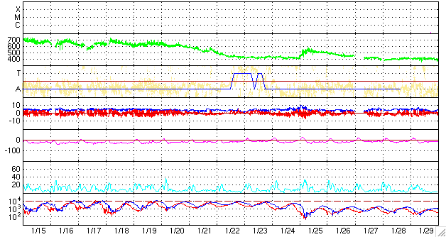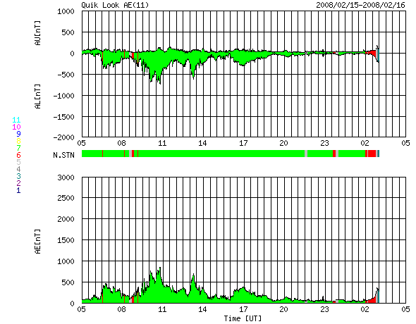 ACEが観測した太陽風の磁場(1番上の枠、白線は全体の強度、赤線は南北成分) および、太陽風の密度(3番目の橙線)、速度(4番目の黄線) (c) NOAA/SWPC ![]() リアルタイムAE指数 下段のAEグラフの値が高くなると、オーロラ活動が活発化しています。 (c) 京都大学, NICT ![]() シベリアで観測された3日間の磁場データ 右側の3分の1が、昨日のデータになります。グラフが上がったり下がったりすると、オーロラ活動が活発化しています。 (c) NICT ![]() 27日の太陽周期に合わせたデータプロット 太陽が同じ面を地球に向けていた27日前の変化から、今後を予想することができます。 (c) NICT