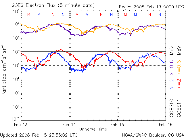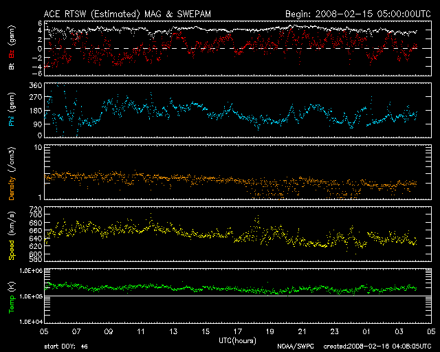 2008/ 2/16 13:06 更新 640km/秒の高速太陽風が続いています。この強い風も明日くらいまででしょう。 担当 篠原 高い速度の太陽風が続いています。 現在も、太陽風の速度は640km/秒でほとんど安定しています。 2月10日に始まって以来、ほぼ6日が経過しています。 長い期間続いている高速風ですが、そろそろ終わりが近づいています。 27日周期で予想すると、明日には600km/秒を割り、 明後日くらいには高速風も終わりになりそうです。 ACEの太陽風データでは、磁場強度が若干下がって、4nTを割りつつあります。 磁場強度の低下は、高速風が後半に入っていることを示すものです。 今後の太陽風の変化に注目してください。 磁気圏のオーロラ活動は、依然活発に続いています。 昨日も、500〜800nTの中規模活動が、AE指数の図の前半に発生しています。 後半見られなくなったのは、太陽風磁場が北寄り(赤線がプラス寄り)になったためでしょう。 速度はまだたいへん高い状態を保っていますので、 磁場が南寄りになれば、活発なオーロラ活動が期待できます。 ただし、磁場強度が次第に減少しつつあること、今後、速度の低下が見込まれることから、 明日以降は磁気圏も次第に穏やかになっていくでしょう。 その後は、1週間程度静かな日が続きます。 放射線帯高エネルギー電子は、やや下がり、ひとまず警戒ラインを割っています。 まだ、高めの状態が続きますが、警戒度は日ごとに下がって行くでしょう。 太陽はとても穏やかです。 SOHO衛星のEIT195カメラの映像 (c) SOHO (ESA & NASA)