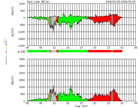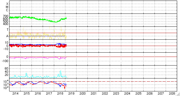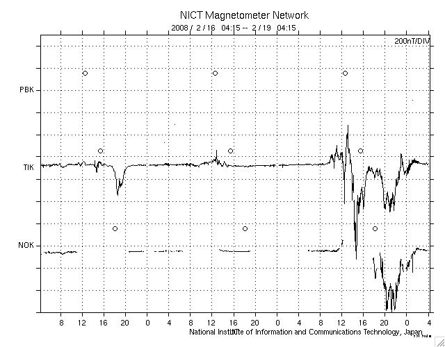 ACEが観測した太陽風の磁場(1番上の枠、白線は全体の強度、赤線は南北成分) および、太陽風の密度(3番目の橙線)、速度(4番目の黄線) (c) NOAA/SWPC ![]() リアルタイムAE指数 下段のAEグラフの値が高くなると、オーロラ活動が活発化しています。 (c) 京都大学, NICT ![]() シベリアで観測された3日間の磁場データ 右側の3分の1が、昨日のデータになります。グラフが上がったり下がったりすると、オーロラ活動が活発化しています。 (c) NICT ![]() 27日の太陽周期に合わせたデータプロット 太陽が同じ面を地球に向けていた27日前の変化から、今後を予想することができます。 (c) NICT