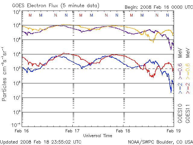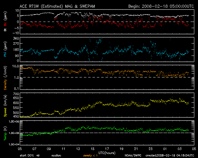 2008/ 2/19 13:20 更新 再び、高速の太陽風がやって来ました(600km/秒)。オーロラも活発です。 担当 篠原 終わったと思ったところで、再び高速太陽風がやって来ました。 昨日の午後、18日15時(世界時18日6時)頃から速度は上昇を始め、 今朝、19日8時(世界時18日23時)には、600km/秒に達してしまいました。 発生源としては、太陽の北半球側に見えている淡いコロナホールでしょうか。 あるいは、南極付近に大きく広がっているコロナホールかもしれませんが、 こちらは出現している緯度が高く、地球へは影響が及びにくい位置です。 27日周期の図を見てください。 前周期には、このタイミングでは高速風は見られませんでした。 この1回転の間に、太陽の様子が変わったのでしょう。 太陽風の速度が上がったことと、磁場が南寄りに変化していたことが重なって、 オーロラもかなり活発化しています。 AE指数では、500nTから1000nTの中規模変動が、ずっと続いて見えます。 シベリア磁場データも、一気に変化が大きくなっています。 ただ、昨日のアラスカは曇りがちで、 残念ながら、ライブカメラではよく見えていませんでした。 太陽の北半球側のコロナホールの影響だとすると、 もう、3〜4日程度影響が残りそうです。 現在は、磁場強度も5nTを保っていますので、 今日、明日くらいまでは、オーロラも活発にみられるかもしれません。 太陽風は、前周期とは変わっていますから、 どのような展開になるか、注目したいところです。 放射線帯高エネルギー電子は、この擾乱の影響で、一気に数を減らしています。 しかし、この後増加に転じる可能性がありますので、明日以降、注意が必要です。 太陽は黒点は見られず、とても静かです。 SOHO衛星のEIT195カメラの映像 (c) SOHO (ESA & NASA)