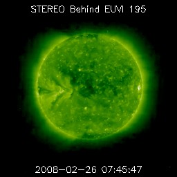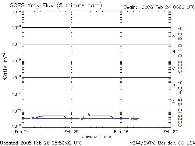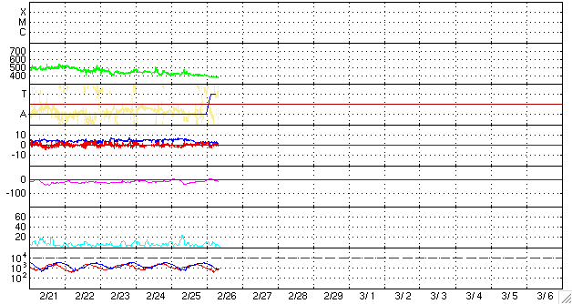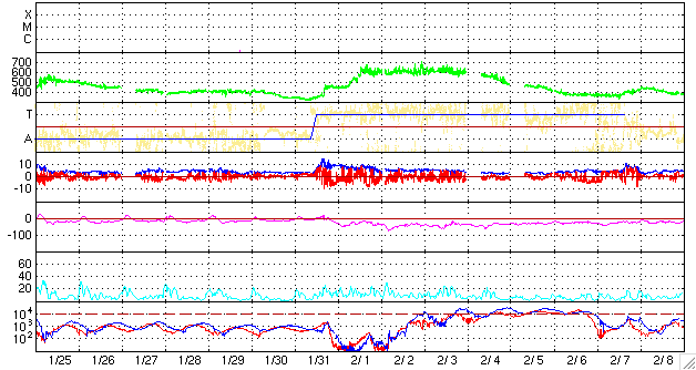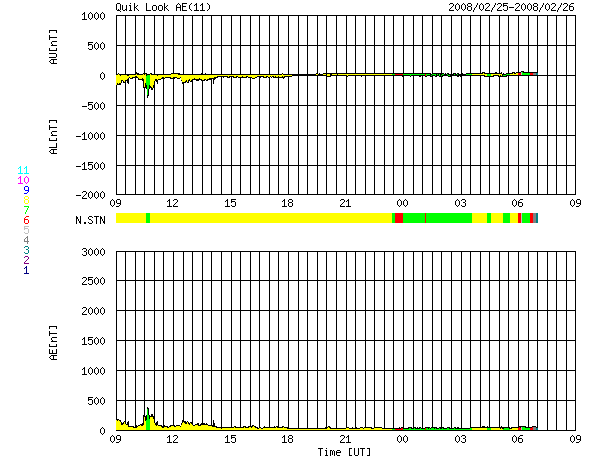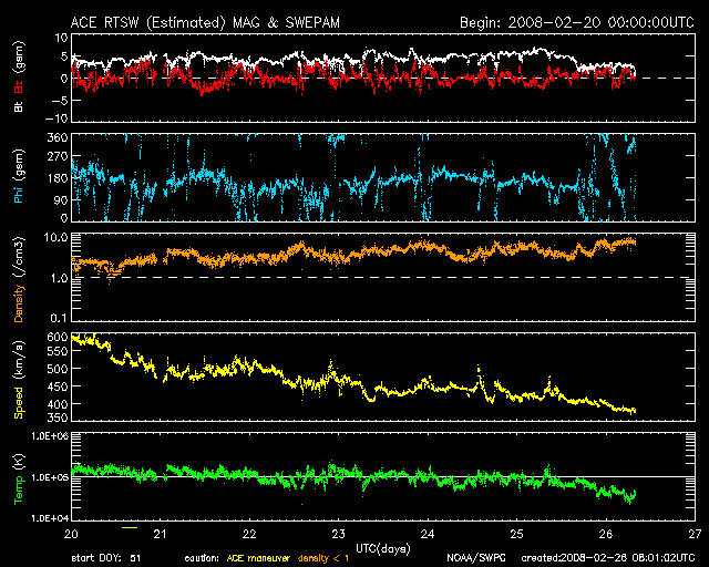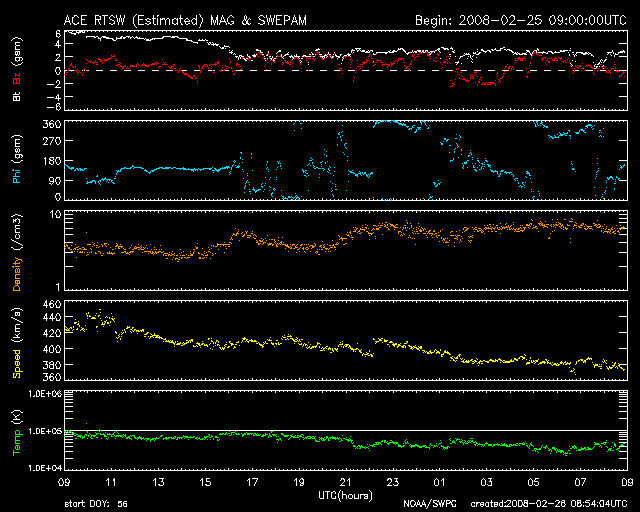 2008/ 2/26 17:55 更新 太陽風の速度は通常レベルで、磁気圏も比較的穏やかです。983黒点群が見えています。 担当 篠原 再び、3日ぶりの更新となります。 現在は、インドネシア、スラウェシ島の南の端、パレパレという町にいます。 こちらは海辺の町で、日本の真夏くらいの暑さです。 新鮮な魚が豊富で、炭火で焼きたての魚やイカをお店で食べることができます。 設置に来ている観測所の裏手には水田が広がっています。 そこだけ見ると、日本にいる様な気がします。 さて、23日以降の宇宙天気ですが、 太陽風は400km/秒台をずっと保っていました。 今日になって、ぎりぎり400km/秒を割って、380km/秒に下がったところです。 27日周期の図によると、今日から明日くらいまではこのまま穏やかに過ぎそうです。 そして、明日の後半か、明後日から次の高速風がやって来そうです。 SOHOの写真が前回の写真で更新が止まり、Bakeoutの状態になっています。 今日は、STEREO Behindの写真を掲載します。 こちらは、地球よりも1日程度先の太陽を見ていると考えてください。 太陽の中心に、横向きにコロナホールが広がっています。 これが、明後日くらいからやってくる高速風の発生源です。 前周期は5日程度高速風が続きましたが、今回も同じ様な規模になりそうです。 この3日間の磁気圏活動は、比較的穏やかでした。 太陽風が400km/秒台を保っていたこともあり、 AE指数で300nTくらいの小規模の活動が度々起こっていた様です。 現在は速度が更に下がっているので、一段と静かになるでしょう。 太陽では、983黒点群が出現しています。 太陽の中心と西端の中間あたりに見えています。 983黒点群は、赤道付近ですが南半球側に出現しています。 磁場の順番を見ると、[白 黒]となっており、 前の周期の性質を持った黒点群です(白=N極、黒=S極)。 次の更新は、帰国後の28日の夜か、29日の朝になります。 以降は通常の更新ペースに戻りますので、もうしばらくお待ちください。 ACE衛星による1週間の太陽風データ。 (c) NOAA/SWPC ![]() STEREOによる太陽のコロナ。中心付近にコロナホールが見えている。2月26日16時半(世界時26日7時半) (c) NASA ![]() SOHOによる可視光の太陽。西側に983黒点群が見えている。2月26日14時半(世界時26日5時半) (c) ESA & NASA ![]() SOHOによる太陽の磁場分布。南半球側の983黒点群は、[白 黒]と、前の周期の順番。2月26日14時半(世界時26日5時半) (c) ESA & NASA ![]() ACEが観測した太陽風の磁場(1番上の枠、白線は全体の強度、赤線は南北成分) および、太陽風の密度(3番目の橙線)、速度(4番目の黄線) (c) NOAA/SWPC ![]() リアルタイムAE指数 下段のAEグラフの値が高くなると、オーロラ活動が活発化しています。 (c) 京都大学, NICT ![]() シベリアで観測された3日間の磁場データ 右側の3分の1が、昨日のデータになります。グラフが上がったり下がったりすると、オーロラ活動が活発化しています。 (c) NICT ![]() 27日の太陽周期に合わせたデータプロット 太陽が同じ面を地球に向けていた27日前の変化から、今後を予想することができます。 (c) NICT