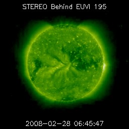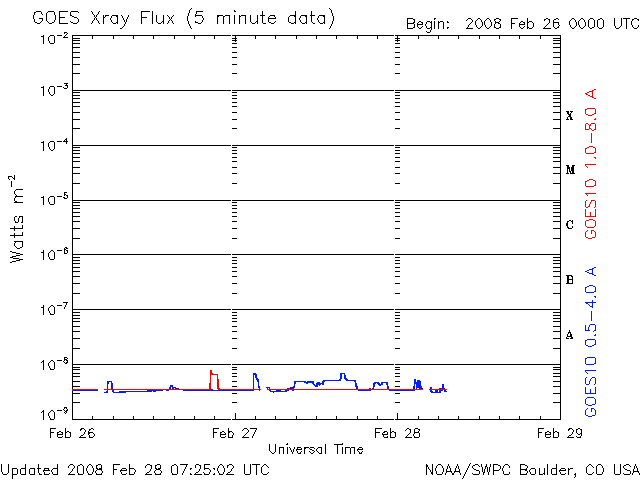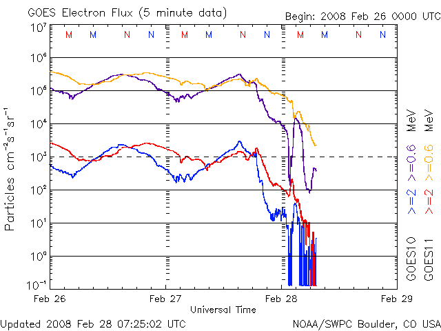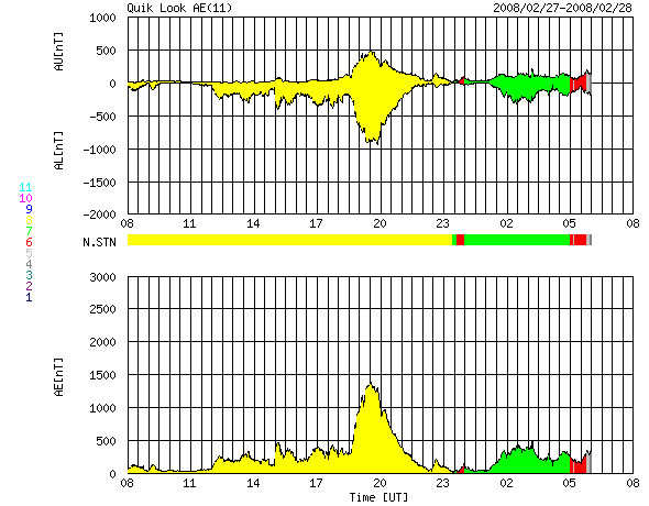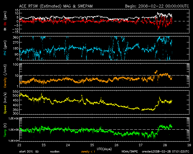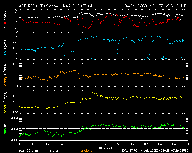 2008/ 2/28 16:30 更新 高速太陽風が始まりました。激しいオーロラ活動も起こっています。 担当 篠原 今回は台北の国際空港からです。 乗り継ぎの合間のため、時間がそれほどありません。今日は簡単に。 高速風の回帰が始まっています。 ACE衛星によると、今日、2月28日に入った頃(世界時では27日15時頃)から、 太陽風の磁場と速度がそれぞれ増加を始めました。 磁場は5nTから10nTに、速度は350km/秒から450km/秒に上がっています。 27日周期の図で前周期の変化を見ると、 速度の本格的な上昇は、まだこれからやって来ると思われます。 磁場強度が強まったままというのも、その可能性を示しています。 引き続き、太陽風の変化に注目してください。 磁場の南北成分を見ると、比較的大きく南北に変動しています。 そのため、南を向いた時に磁気圏のオーロラ活動を活発に起こしています。 AE指数では、1300nTに達する大きな活動が発生しています。 その後は、300nT前後の小規模活動が続いています。 今後、速度の上昇が見込まれるので、オーロラ活動も活発に続く可能性があります。 高速太陽風は、これから3〜4日程度続くと予想されます。 STEREOの太陽写真では、コロナホールが太陽の中心をやや通過した頃です。 STEREOの写真は、1日程度先を見ていますので、 この点でも、もう4日くらい続くというのは妥当な印象です。 また、この写真では、太陽の東端に次のコロナホールが顔を見せています。 こちらは、3月8日以降に予想される高速風の発生源です。 放射線帯の高エネルギー電子は、大きく数を減らしています。 今後増加に転じると思われますので、注意が必要です。 ACE衛星による1週間の太陽風データ。 (c) NOAA/SWPC ![]() STEREOによる太陽のコロナ。2月28日16時(世界時28日7時) (c) NASA ![]() ACEが観測した太陽風の磁場(1番上の枠、白線は全体の強度、赤線は南北成分) および、太陽風の密度(3番目の橙線)、速度(4番目の黄線) (c) NOAA/SWPC ![]() リアルタイムAE指数 下段のAEグラフの値が高くなると、オーロラ活動が活発化しています。 (c) 京都大学, NICT ![]() シベリアで観測された3日間の磁場データ 右側の3分の1が、昨日のデータになります。グラフが上がったり下がったりすると、オーロラ活動が活発化しています。 (c) NICT ![]() GOES衛星による、静止衛星軌道における高エネルギー電子の変化 (c) NOAA/SWPC ![]() SOHO衛星のMDIカメラによる太陽黒点 (c) SOHO (ESA & NASA) ![]() GOES衛星の太陽X線データ (c) NOAA/SWPC ![]() | |||||||||||||||||||||||||||||||||||||||||||||||||||||||||||||||||||||||||||||||||||||||||||||||||||||||||||||||||||||||||||||||||||||||||||||||||||||||||||||||||||||||||||||||||||||||||