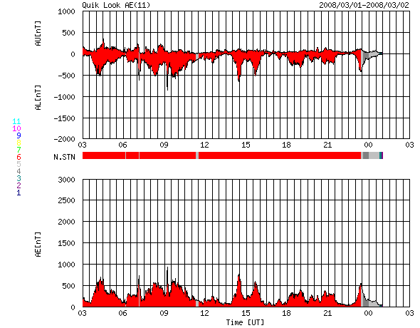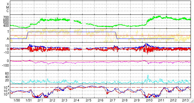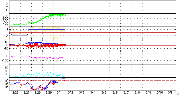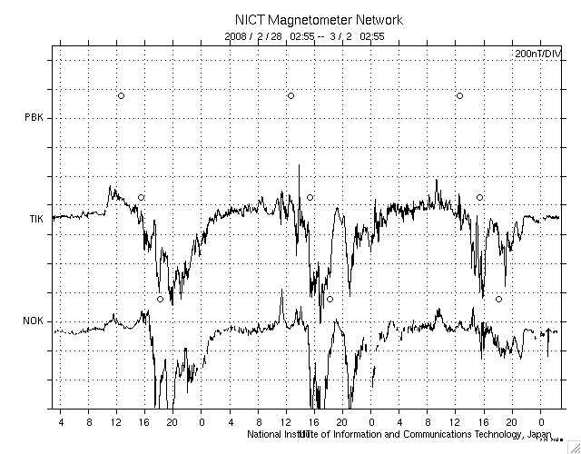 ACEが観測した太陽風の磁場(1番上の枠、白線は全体の強度、赤線は南北成分) および、太陽風の密度(3番目の橙線)、速度(4番目の黄線) (c) NOAA/SWPC ![]() リアルタイムAE指数 下段のAEグラフの値が高くなると、オーロラ活動が活発化しています。 (c) 京都大学, NICT ![]() シベリアで観測された3日間の磁場データ 右側の3分の1が、昨日のデータになります。グラフが上がったり下がったりすると、オーロラ活動が活発化しています。 (c) NICT ![]() 27日の太陽周期に合わせたデータプロット 太陽が同じ面を地球に向けていた27日前の変化から、今後を予想することができます。 (c) NICT