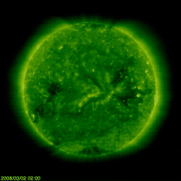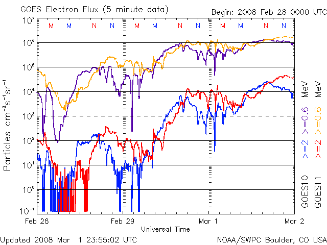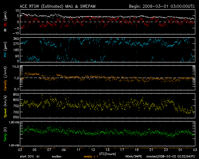 2008/ 3/ 2 11:53 更新 かなり高速の太陽風が続いています。後半に入りつつあるので、これから速度が下がるでしょう。 担当 篠原 たいへん高速の太陽風が続いています。 昨日のニュース以降、750〜800km/秒の高速風が安定して続いています。 コロナホール起源の高速風としては、かなり高い速度になっています。 一方、高速風領域としてはピークを過ぎつつある様です。 磁場強度は5nTをやや下回る様になりました。 速度も、ACEの最新のデータ(右端)では700km/秒近くに落ちており、 高速風は後半に入りつつあることをうかがわせています。 昨日以降のオーロラの活動は、やや規模が小さくなっています。 AE指数では、700nTくらいの中規模活動が何度も発生しており、活発ではありましたが、 昨日のAEの図と比べると、活発さが一段落ちていることは確かです。 時間の推移としても、後半は次第に変動が弱まっています。 これは、太陽風の磁場強度が弱まりつつあるため、 南向きの変動が小さくなっていることによります。 速度はたいへん高いのですが、もうひとつの要素である南向き磁場が弱まれば、 磁気圏へのエネルギーの流れ込みは弱まって行くのです。 高速太陽風は、これから速度の低下が始まると予想されます。 27日周期の図では、前周期は2月4-5日に速度の低下が見られました。 これは今周期の今日、明日に相当します。 ただ、今回は高速風がかなり強まっていますから、後半は少し長引くかもしれません。 今日の変化を見ると、ある程度予想も立つのではないかと思います。 また、この高速太陽風が通過した後、 今度は3月8日くらいから次の高速太陽風がやって来ます。 高速太陽風の影響で、放射線帯高エネルギー電子がかなり強まっています。 10,000のレベルを超えて、赤線のGOES11は50,000近くまで上がっています。 衛星の運用では障害が発生しやすくなっています。 更に、もう一段上がる可能性もあり、注意が必要です。 この高い状態は、1週間程度続く可能性があります。 太陽は無黒点で、たいへん穏やかです。 SOHO衛星のEIT195カメラの映像 (c) SOHO (ESA & NASA)