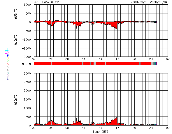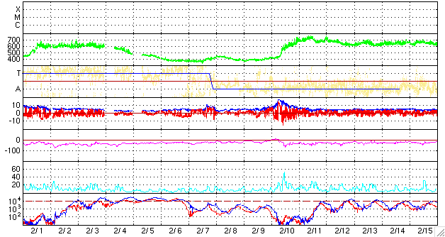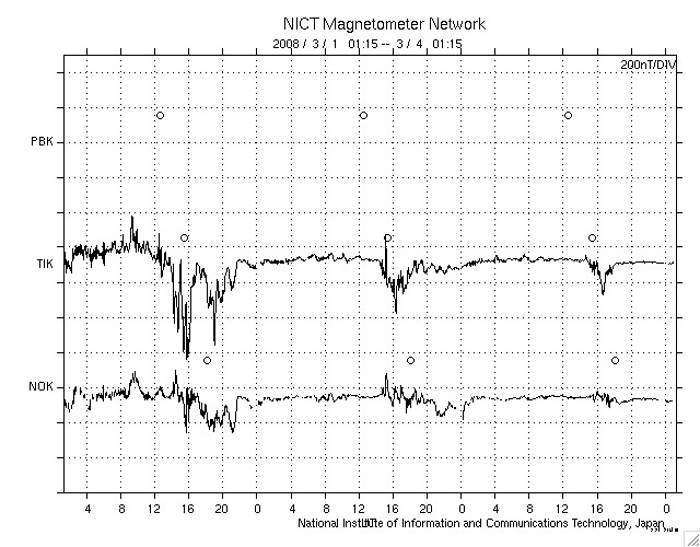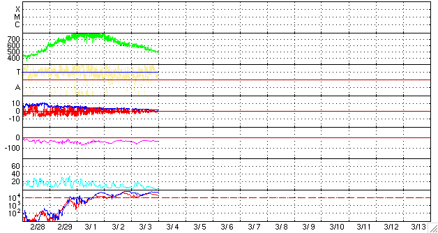 ACEが観測した太陽風の磁場(1番上の枠、白線は全体の強度、赤線は南北成分) および、太陽風の密度(3番目の橙線)、速度(4番目の黄線) (c) NOAA/SWPC ![]() リアルタイムAE指数 下段のAEグラフの値が高くなると、オーロラ活動が活発化しています。 (c) 京都大学, NICT ![]() シベリアで観測された3日間の磁場データ 右側の3分の1が、昨日のデータになります。グラフが上がったり下がったりすると、オーロラ活動が活発化しています。 (c) NICT ![]() 27日の太陽周期に合わせたデータプロット 太陽が同じ面を地球に向けていた27日前の変化から、今後を予想することができます。 (c) NICT