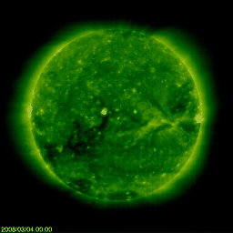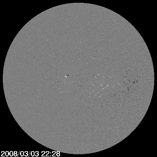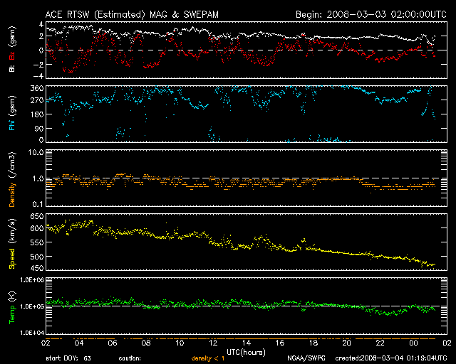 2008/ 3/ 4 10:20 更新 太陽風の速度は下がり、地球は高速風を抜け出しつつあります。放射線帯の強まった状態が続いています。 担当 篠原 太陽風の速度は、どんどん下がっています。 昨日から100km/秒以上下がり、現在、470km/秒になっています。 まだやや高速ですが、高速太陽風は終わろうとしています。 27日周期の図で、ここ数日の太陽風速度の変化を見てください。 2日ほどでぐんぐん上昇して、800km/秒に達しましたが、 低下も早く、2日ほどで400km/秒台へと下がっています。 全体としては、高速風は5日間ほどでした。 速度が下がって来たことと、磁場強度が既に弱まっているため、 地球の磁気圏のオーロラ活動もだいぶ弱まっています。 AE指数では、300nTくらいの小規模活動が見られた程度です。 シベリア磁場データも、変化の幅が日を追うごとに小さくなっています。 このまま太陽風は穏やかになり、オーロラもすっかり静かになるでしょう。 穏やかな状態は、7日頃まで続くと予想されます。 SOHO EIT195の太陽コロナを見ると、 太陽の南東(左下)に広がるコロナホールの先端(右端)が、 太陽の中心線に達しようとしています。 中心線に達すると、3日後くらいから高速風がやって来ますから、 7日以降に次の乱れがやってくることになるでしょう。 さて、太陽面にとても小さな黒点が出現しています。 太陽の中心からやや東(左)です。 今日の最初に、SOHOの可視光と磁場の写真を掲載します。 見比べて黒点を見つけてください。 磁場の黒白が、ペアになって強まっているところにできています。 SOHO EIT195に戻ると、黒点の場所が明るく光って見えています。 984黒点群となると思われますが、今回も赤道近くの黒点でした。 放射線帯の高エネルギー電子は、とても強まった状態が続いています。 衛星の運用では、障害が起こりやすくなっていますので、注意が必要です。 磁気圏が静穏だと、高エネルギー電子の減少はとてもゆっくりです。 注意が必要な状態は、7日くらいまで続くでしょう。 SOHO MDIカメラによる、4日7時半(世界時3日22時半)の太陽。中心近くに、とても小さな黒点が見えています。 (c) ESA & NASA ![]() SOHO MDIカメラによる、4日7時半(世界時3日22時半)の太陽磁場。黒点の場所に、小さな磁場の強まりができています。 (c) ESA & NASA ![]() SOHO衛星のEIT195カメラの映像 (c) SOHO (ESA & NASA)