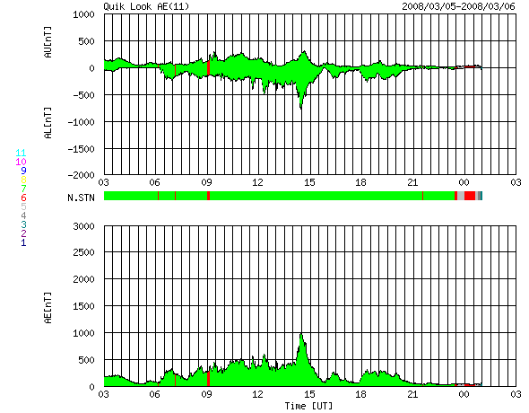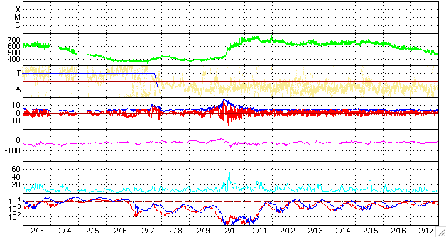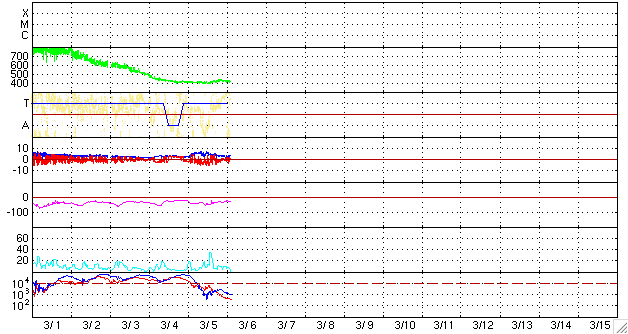 ACEが観測した太陽風の磁場(1番上の枠、白線は全体の強度、赤線は南北成分) および、太陽風の密度(3番目の橙線)、速度(4番目の黄線) (c) NOAA/SWPC ![]() リアルタイムAE指数 下段のAEグラフの値が高くなると、オーロラ活動が活発化しています。 (c) 京都大学, NICT ![]() シベリアで観測された3日間の磁場データ 右側の3分の1が、昨日のデータになります。グラフが上がったり下がったりすると、オーロラ活動が活発化しています。 (c) NICT ![]() 27日の太陽周期に合わせたデータプロット 太陽が同じ面を地球に向けていた27日前の変化から、今後を予想することができます。 (c) NICT