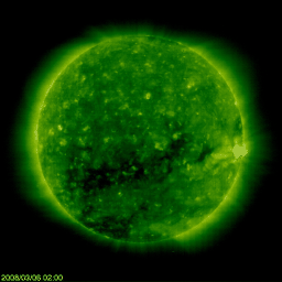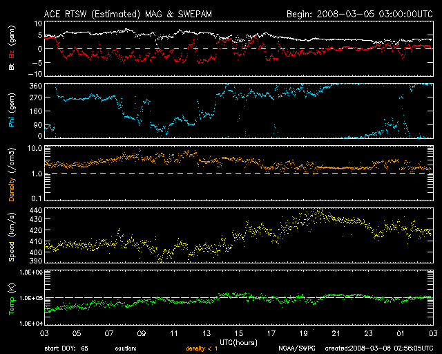 2008/ 3/ 6 11:56 更新 太陽風は400km/秒の速度です。南向き磁場の影響で、磁気圏が活動的になりました。 担当 篠原 400km/秒の通常の速度レベルの太陽風が続いています。 磁場強度は、ACEの図で前半が5nT、後半は弱まって3nTといったところです。 太陽風としては穏やかな状態なのですが、 昨日の午後いっぱい(ACEの図の前半)、磁場の南北成分が南側に偏って変化していました。 -4nTくらいの南向きがずっと続いています。 この影響で、磁気圏活動がやや活発になりました。 AE指数を見ると、500nT前後の変動が連続的に発生しています。 シベリア磁場データも、昨日のところ(右側3分の1)で、変動の幅が大きくなっています。 このように、速度は穏やかでも、磁場の方向次第で磁気圏が活動的になることがあります。 ただ、風速が高くありませんので、激しい変化を起こすほどではありません。 これから明日までは、穏やかな太陽風が続くでしょう。 磁気圏も基本的には穏やかなままでしょう。 27日周期の図によると、明日の後半か、明後日くらいから太陽風の速度が上がりそうです。 SOHO EIT195で太陽を見ると、 コロナホールが、太陽のやや南寄りに、東西に長く広がって見えています。 先頭(右端)は、既に西側半分近くへ届いています。 この写真の様子だと、高速風の到来は少し早まって、明日には始まるかもしれません。 また、横方向に幅広く伸びていることから、今回も継続期間が長くなりそうです。 前周期は、10日にわたって高速風が続いています。 高速風の到来とともに、オーロラが活発になるでしょう。 アラスカのライブカメラにも注目です。 磁気圏活動の強まりによって、 放射線帯の高エネルギー電子は大きく数を減らしています。 数万あったところから、数千くらいに下がっています。 ひとまず、警戒状態からは抜け出したようです。 太陽では、984黒点群が出現しています。 西の端のあたりです。 今回も、低緯度の出現です。 SOHOによる太陽の可視光写真。西の端に黒点が見えています。6日7時半(世界時5日22時半) (c) SOHO (ESA & NASA) ![]() SOHO衛星のEIT195カメラの映像 (c) SOHO (ESA & NASA)
