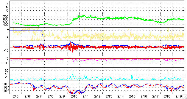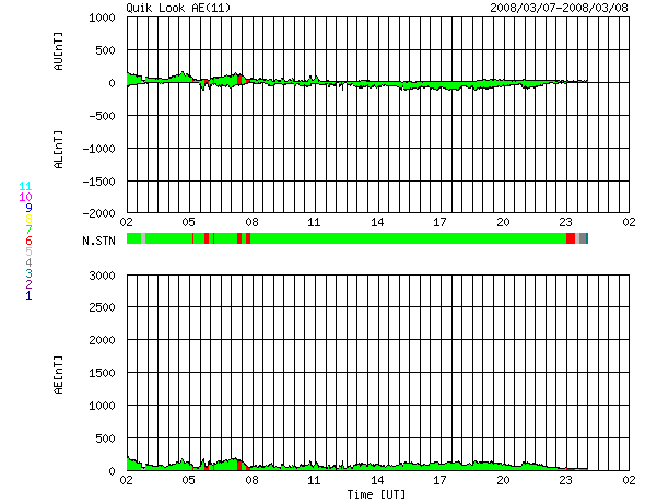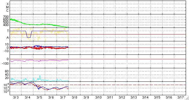 ACEが観測した太陽風の磁場(1番上の枠、白線は全体の強度、赤線は南北成分) および、太陽風の密度(3番目の橙線)、速度(4番目の黄線) (c) NOAA/SWPC ![]() リアルタイムAE指数 下段のAEグラフの値が高くなると、オーロラ活動が活発化しています。 (c) 京都大学, NICT ![]() シベリアで観測された3日間の磁場データ 右側の3分の1が、昨日のデータになります。グラフが上がったり下がったりすると、オーロラ活動が活発化しています。 (c) NICT ![]() 27日の太陽周期に合わせたデータプロット 太陽が同じ面を地球に向けていた27日前の変化から、今後を予想することができます。 (c) NICT