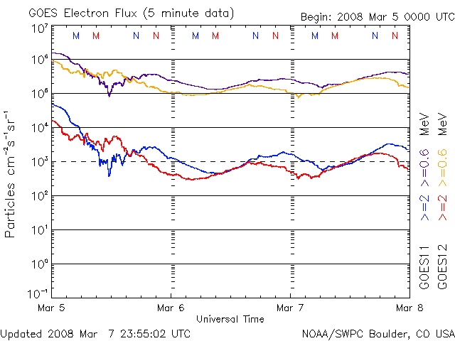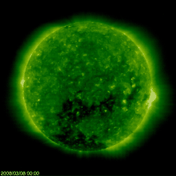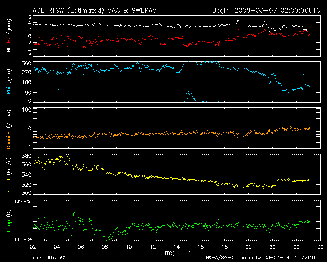 2008/ 3/ 8 10:06 更新 太陽風はかなり遅くなっています(320km/秒)。これから高速太陽風がやってくるでしょう。 担当 篠原 太陽風の速度は更に下がり、320km/秒とかなり遅くなっています。 磁場強度も3nTに弱まっていて、太陽風はとても穏やかです。 昨日からプラズマ密度がじわじわと上がり続け、10個/cm^3になりました。 これは、高速太陽風の前触れの変化だと思われます。 前周期も、高速風到来前に同様の変化が見られています(2月10日記事)。 この後、太陽風の磁場強度が上昇を始めるでしょう。 それとともに、高速風も始まると思われます。 これからのACEのデータに注目してください。 太陽風が穏やかなので、磁気圏もとても静かです。 AE指数、シベリア磁場データともに、ほとんど変化が見られません。 この静かな状態ももうしばらくでしょう。 太陽風の磁場強度が強まり始めると、南向き成分の変化によって、 活発なオーロラ活動が作られます。 磁場の南向き成分とは、ACEの赤線がマイナスになることです(プラスは北向き)。 このグラフが-5nTを越えて大きく南を向くと、オーロラ活動は激しくなります。 太陽風は速度の変化も重要ですが、磁場が南を向くことでオーロラのスイッチが入るのです。 これからやってくる高速風は、前周期も活発なオーロラ活動を引き起こしました。 オーロラシーズンも終わりに近づいています。 アラスカのライブカメラをお楽しみください。 放射線帯の高エネルギー電子は、レベルが下がったままです。 高速風が来ると、再び増加を始めますから、明後日以降は注意が必要でしょう。 太陽は無黒点です。 984黒点群は向こう側に行ってしまいました。 SOHO衛星のEIT195カメラの映像 (c) SOHO (ESA & NASA)