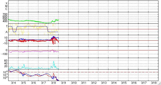 ACEが観測した太陽風の磁場(1番上の枠、白線は全体の強度、赤線は南北成分) および、太陽風の密度(3番目の橙線)、速度(4番目の黄線) (c) NOAA/SWPC ![]() リアルタイムAE指数 下段のAEグラフの値が高くなると、オーロラ活動が活発化しています。 (c) 京都大学, NICT ![]() シベリアで観測された3日間の磁場データ 右側の3分の1が、昨日のデータになります。グラフが上がったり下がったりすると、オーロラ活動が活発化しています。 (c) NICT ![]() 27日の太陽周期に合わせたデータプロット 太陽が同じ面を地球に向けていた27日前の変化から、今後を予想することができます。 (c) NICT