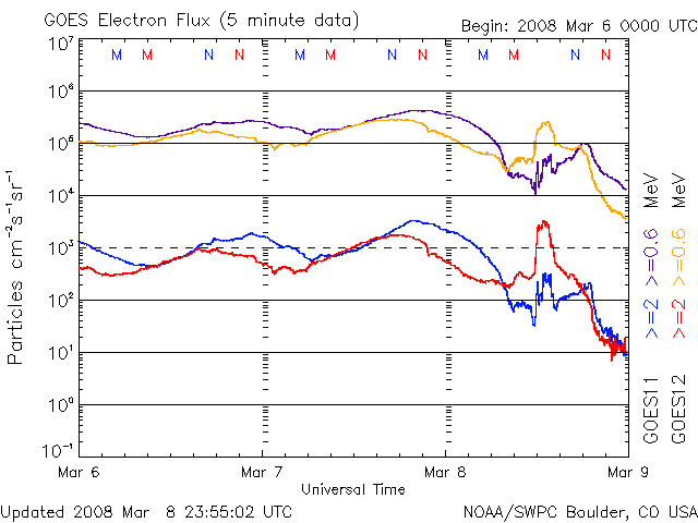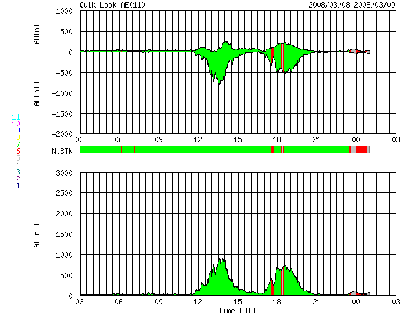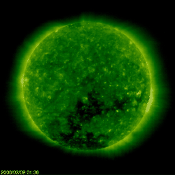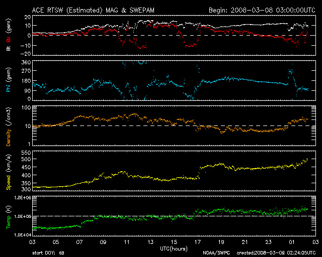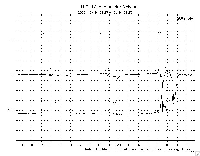 2008/ 3/ 9 11:25 更新 太陽風磁場が強まり、活発なオーロラが発生しています。速度の上昇はこれからの様です。 担当 篠原 高速太陽風の立ち上がりが、前周期よりも遅れています。 太陽風の磁場強度は、8日16時(世界時8日7時)から強まり始め、10〜15nTに強まりました。 それに続いて、速度も変化しているのですが、 せいぜい450km/秒に上がったくらいで、それほどの高速になっていません。 27日周期の図で前周期、2月10日の変化を見ると、 磁場強度が上がるとともに、速度も600km/秒を超えて行ったのですが、 今回は、それほどきれいな立ち上がりにはなっていません。 SOHO EIT195の太陽写真を見ると、コロナホールは、十分に西側にせり出しています。 太陽風の速度は、これからぐっと上がって行くのでしょう。 太陽風の速度はそれほど上がりませんでしたが、 磁場が強まったため、-10nTくらいの大きな南向き(赤線のマイナス)が2度ほど見られています。 その影響で、活発なオーロラ活動が発生しています。 AE指数では、1000nT、700nTの中規模の変化が記録されています。 もし速度がもっと高ければ、より激しい変化になっていたでしょう。 太陽風磁場は現在も10nTに強まったままです。 今後も、活発なオーロラ活動が見られそうです。 アラスカライブカメラにも注目してください。 放射線帯の高エネルギー電子は、大きく数を減らしています。 今後、太陽風の速度が高まると、上昇に転じるでしょう。 しばらくは注意が必要です。 太陽は無黒点で、たいへん穏やかです。 SOHO衛星のEIT195カメラの映像 (c) SOHO (ESA & NASA)