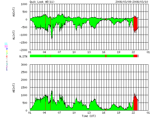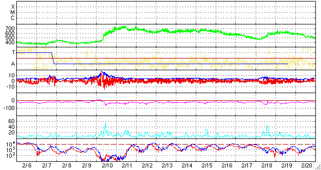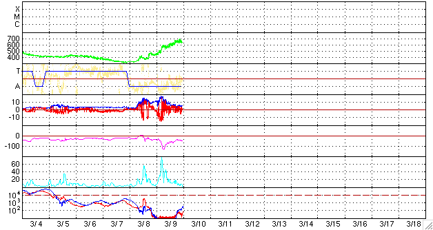 ACEが観測した太陽風の磁場(1番上の枠、白線は全体の強度、赤線は南北成分) および、太陽風の密度(3番目の橙線)、速度(4番目の黄線) (c) NOAA/SWPC ![]() リアルタイムAE指数 下段のAEグラフの値が高くなると、オーロラ活動が活発化しています。 (c) 京都大学, NICT ![]() シベリアで観測された3日間の磁場データ 右側の3分の1が、昨日のデータになります。グラフが上がったり下がったりすると、オーロラ活動が活発化しています。 (c) NICT ![]() 27日の太陽周期に合わせたデータプロット 太陽が同じ面を地球に向けていた27日前の変化から、今後を予想することができます。 (c) NICT