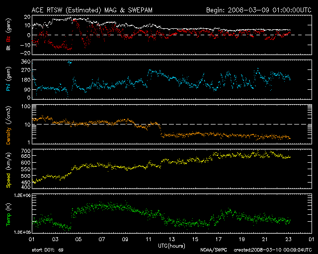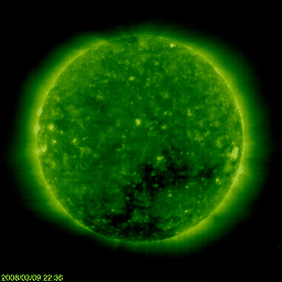 2008/ 3/10 09:06 更新 太陽風の速度は650km/秒に上がっています。活発なオーロラ活動が発生しています。 担当 篠原 昨日のニュースの後、太陽風の速度は上昇を始め、 9日14時(世界時9日5時)に550km/秒、 そして、10日2時(世界時9日17時)には650km/秒に上がりました。 27日周期の図で、前周期の太陽風速度の上がり方と、 今回の速度の上がり方を見比べてください。 前回の立ち上がり方が早かったのに対し、今回はだらだらとした上昇になっています。 コロナホールの分布がそれほど変わったようにも見えなかったのですが、 高速風の吹き出し具合は変化していたようです。 太陽風の磁場強度は、図の前半では10〜15nTと強まった状態でした。 南北成分が大きく南に振れ、ここで激しいオーロラ活動が発生しています。 AE指数では、1000nT前後のかなり強い変化が数時間にわたって観測されています。 速度が600km/秒を超える頃、磁場強度は弱まって、現在は5nTくらいです。 それでも、速度がかなり高まっているため、 AE指数で500〜1000nTの中規模活動が断続的に発生しています。 このあとも引き続き、オーロラ観望のチャンスが続きそうです。 27日周期の図に戻ると、前周期は、高速風は1週間ほど続きました。 (それに続いて、もうひとつ高速風が来ています) 今回も同様と考えると、この風は3月15日くらいまで続くと見込まれます。 SOHO EIT195で太陽コロナを見ると、 コロナホールは、低緯度側から次第に南極側(下の端)に向かって伸びています。 あまり緯度が高くなる(南極に近くなる)と、地球へは影響しなくなります。 南へ大きく下がる領域が、今日いっぱいくらいで太陽の中心線を通過しそうなので、 高速風が続くのがそれから4日程度と考えると、15日までというのはだいだい妥当かもしれません。 立ち上がりの様子が変わったように、高速風の様子は1周期ごとに変わって行きます。 終わり方はどのようになるでしょうか。 放射線帯の高エネルギー電子は、更に大きく数を減らしています。 しかし、この後は上昇に転じるでしょう。 どこまで上がるのか、今日、明日と注意する必要があります。 太陽は今日も無黒点です。 静かな日が続いています。 SOHO衛星のEIT195カメラの映像 (c) SOHO (ESA & NASA)
