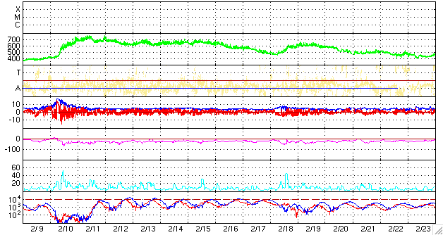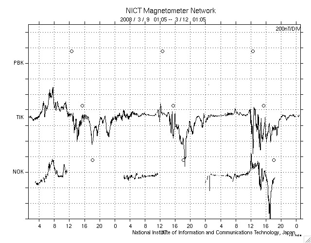 ACEが観測した太陽風の磁場(1番上の枠、白線は全体の強度、赤線は南北成分) および、太陽風の密度(3番目の橙線)、速度(4番目の黄線) (c) NOAA/SWPC ![]() リアルタイムAE指数 下段のAEグラフの値が高くなると、オーロラ活動が活発化しています。 (c) 京都大学, NICT ![]() シベリアで観測された3日間の磁場データ 右側の3分の1が、昨日のデータになります。グラフが上がったり下がったりすると、オーロラ活動が活発化しています。 (c) NICT ![]() 27日の太陽周期に合わせたデータプロット 太陽が同じ面を地球に向けていた27日前の変化から、今後を予想することができます。 (c) NICT