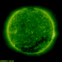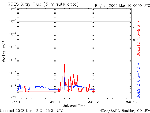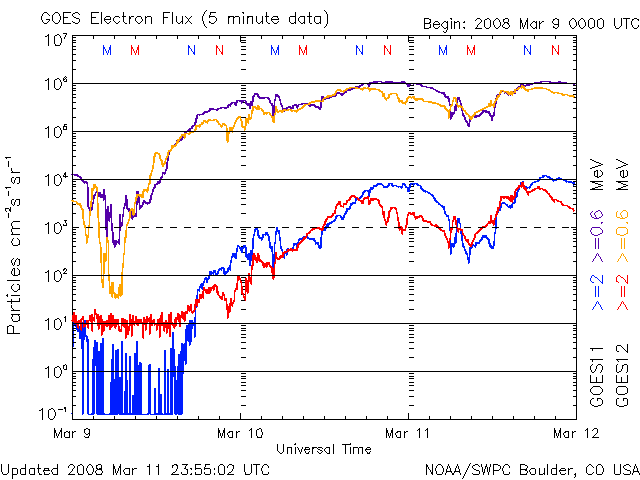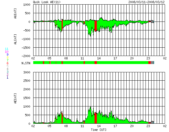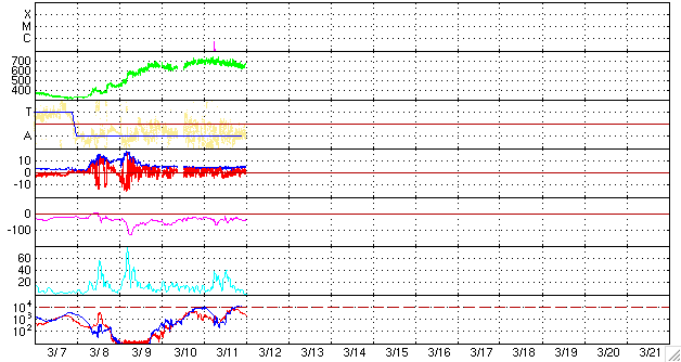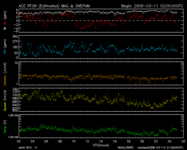 2008/ 3/12 10:06 更新 700km/秒近い高速太陽風が続いています。オーロラも活発です。放射線帯が強まっています。 担当 篠原 かなり速度の高い太陽風が続いています。 700〜650km/秒のなかで、ほぼ安定した高速状態を保っています。 磁場強度も4nTでほとんど一定です。 地球は高速風領域のまん中を走っている様です。 磁場の南北成分は、北寄りになったり、南寄りになったり、 時間帯によって方向にかたよりが見られています。 南側に寄ったところで、活発なオーロラ活動が発生しています。 AE指数では、700nTのひと山と、1000nTに達する大きな山と、 ふたつの時間帯で大きな変化が記録されています。 シベリア磁場データも、昨日はぎざぎざと激しい変化で揺れています。 アラスカのライブカメラでは、ずっとオーロラの光を見ることができました。 その中の、一番きれいだった写真を掲載します。 SOHO EIT195の太陽写真を見ると、 コロナホールは、次第に太陽の西側へ向かっています。 高速風の影響も、これから後半へと向かいます。 27日周期の図では、まだ4日くらい続きそうですが、 コロナホールは高緯度側へ伸びていて、地球への影響は弱まる傾向です。 前周期と同じ期間高速風が続くのか、早めに終わってしまうのか、 そのあたりに注目しています。 今日、明日くらいは、オーロラ活動も十分期待できるでしょう。 放射線帯の高エネルギー電子は、もうすこし上がって、警戒レベルに達しています。 衛星の運用などでは注意が必要な状態になっています。 太陽では、昨日西の端に見えていた985黒点群が、ある程度活動的になったようで、 X線のグラフに小さな変化が記録されています。 985黒点群は、もう太陽の向こう側に没してしまって見えません。 太陽は無黒点になっています。 アラスカのオーロラライブカメラで撮影された、11日18時(現地11日0時、世界時11日9時)のオーロラ。 (c) NICT/SALMON ![]() SOHO衛星のEIT195カメラの映像 (c) SOHO (ESA & NASA)