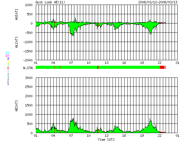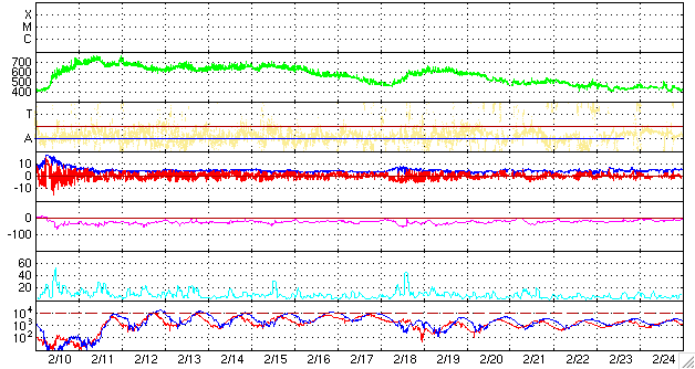 ACEが観測した太陽風の磁場(1番上の枠、白線は全体の強度、赤線は南北成分) および、太陽風の密度(3番目の橙線)、速度(4番目の黄線) (c) NOAA/SWPC ![]() リアルタイムAE指数 下段のAEグラフの値が高くなると、オーロラ活動が活発化しています。 (c) 京都大学, NICT ![]() シベリアで観測された3日間の磁場データ 右側の3分の1が、昨日のデータになります。グラフが上がったり下がったりすると、オーロラ活動が活発化しています。 (c) NICT ![]() 27日の太陽周期に合わせたデータプロット 太陽が同じ面を地球に向けていた27日前の変化から、今後を予想することができます。 (c) NICT