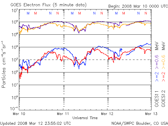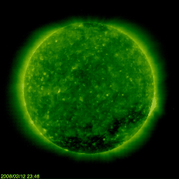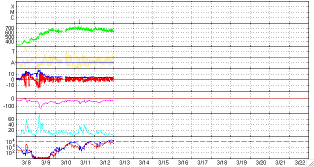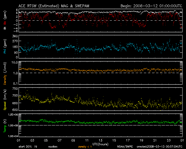 2008/ 3/13 09:58 更新 600km/秒台前半に下がりましたが、高速の太陽風は続いています。オーロラ活動も続いています。 担当 篠原 太陽風の速度はやや下がり、650km/秒弱くらいになっています。 速度としては依然かなり高い値ですので、注意して下さい。 高速風領域として後半に入ってきたということだと思いますが、 磁場強度はまだ4nTを保っているので、 高速風がすぐに終わり始めるということでもないだろうと思います。 オーロラは活動的な状態が続いています。 AE指数では、700nTくらいの中規模変動を含めて、4〜5回くらい活発な動きがあったようです。 その一部は、アラスカのライブカメラでも見えていたのですが、 現地が曇り気味で、見え方としては物足りない印象でした。 AE指数の変化の様子は、次第に小さくなっています。 これから速度が下がり、磁場強度が弱まってくると、 それにつれてオーロラの変化も弱まって行くでしょう。 27日周期の図から考えると、高速風は、ひとまず明後日くらいまでと見られます。 前周期では、それに続いて、もう3日ほど小さな速度の山が来ていました(2月18-20日)。 今回はどうなるでしょうか。 来週の注目点でしょう。 放射線帯高エネルギー電子は、少し上昇しています。 警戒レベルにしっかり入って来ましたので、衛星の運用などでは注意が必要です。 この高いレベルは、しばらく続くでしょう。 太陽は無黒点です。 985黒点群が見えなくなり、X線のグラフは静かになりました。 SOHO衛星のEIT195カメラの映像 (c) SOHO (ESA & NASA)