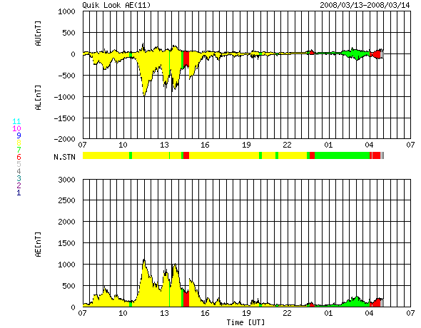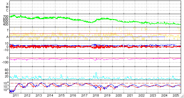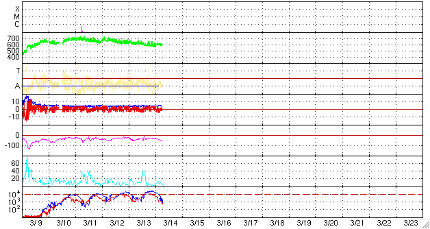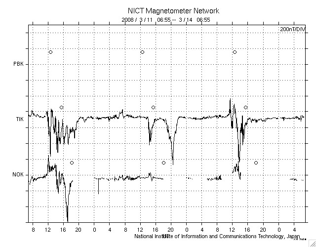 ACEが観測した太陽風の磁場(1番上の枠、白線は全体の強度、赤線は南北成分) および、太陽風の密度(3番目の橙線)、速度(4番目の黄線) (c) NOAA/SWPC ![]() リアルタイムAE指数 下段のAEグラフの値が高くなると、オーロラ活動が活発化しています。 (c) 京都大学, NICT ![]() シベリアで観測された3日間の磁場データ 右側の3分の1が、昨日のデータになります。グラフが上がったり下がったりすると、オーロラ活動が活発化しています。 (c) NICT ![]() 27日の太陽周期に合わせたデータプロット 太陽が同じ面を地球に向けていた27日前の変化から、今後を予想することができます。 (c) NICT