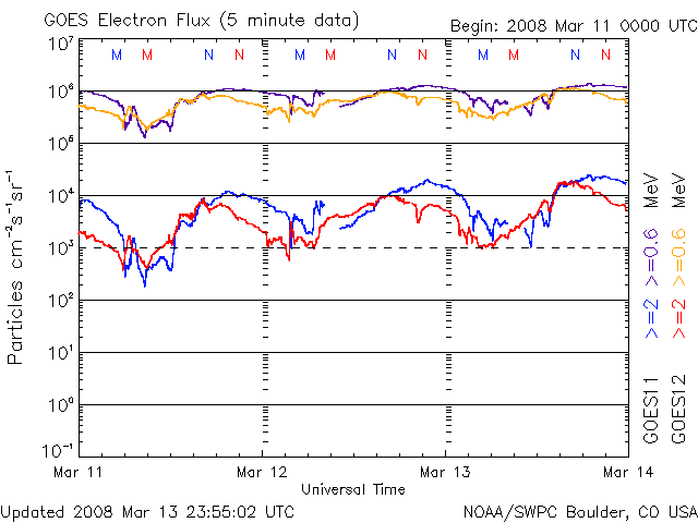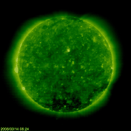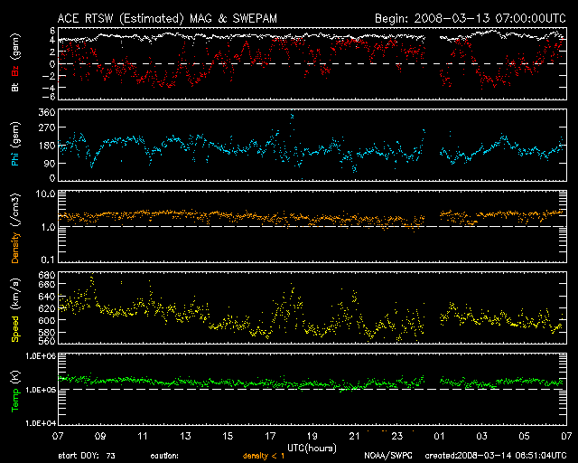 2008/ 3/14 15:52 更新 600km/秒の高速太陽風が続いています。活発なオーロラも発生しています。 担当 篠原 高速太陽風は、600km/秒の高い速度で安定して続いています。 磁場強度も4nTで安定しています。 高速風は、このまま前周期と同じ期間くらい続くことになりそうです。 速度がかなり高いので、活発なオーロラ活動も発生しています。 AE指数で1000nTに達する変化が、図の前半に見られています。 ここは、太陽風の磁場が、-4nT程度に南向きにかたよっていた時間帯です(ACEの図)。 今日の磁場は、その他の時間帯は北寄りになっています。 そのため、AE指数も、その他の時間帯は穏やかになっています。 太陽風磁場とオーロラ活動を比較するときは、 速度の変化とともに、磁場の南向き(マイナス)、北向き(プラス)にも注意して下さい。 高速風はまだ続きそうですので、 今後も、太陽風の磁場が南寄りに変化すると、オーロラも活発になるでしょう。 放射線帯の高エネルギー電子は、さらに少し強まっています。 10,000の警戒レベルを余裕で超えるようになっています。 衛星の運用などでは、注意が必要な状態が続きます。 太陽のフレア活動は穏やかです。 SOHO EIT195を見ると、太陽のまん中の北側に小さく明るい点が見えています。 また、東端にも明るい部分が見えます。 この辺りから、新しく黒点ができたりするでしょうか。 SOHO衛星のEIT195カメラの映像 (c) SOHO (ESA & NASA)