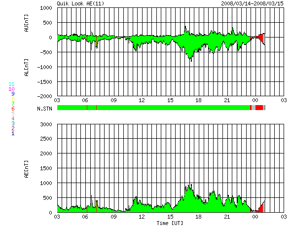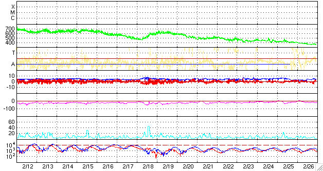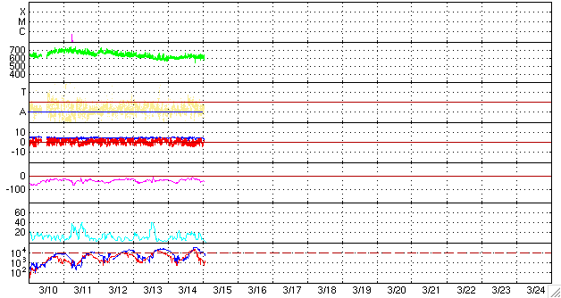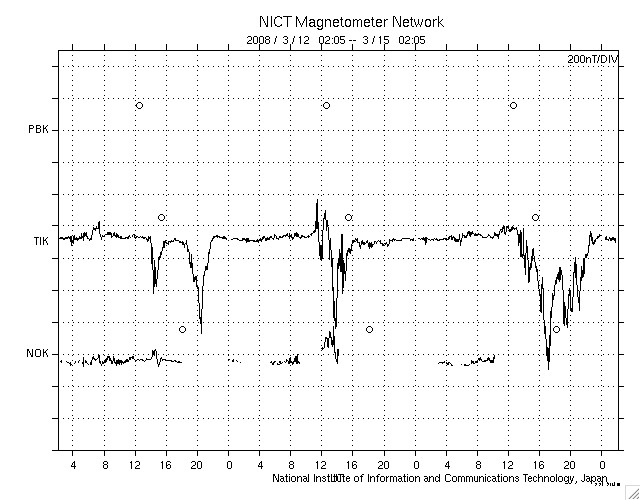 ACEが観測した太陽風の磁場(1番上の枠、白線は全体の強度、赤線は南北成分) および、太陽風の密度(3番目の橙線)、速度(4番目の黄線) (c) NOAA/SWPC ![]() リアルタイムAE指数 下段のAEグラフの値が高くなると、オーロラ活動が活発化しています。 (c) 京都大学, NICT ![]() シベリアで観測された3日間の磁場データ 右側の3分の1が、昨日のデータになります。グラフが上がったり下がったりすると、オーロラ活動が活発化しています。 (c) NICT ![]() 27日の太陽周期に合わせたデータプロット 太陽が同じ面を地球に向けていた27日前の変化から、今後を予想することができます。 (c) NICT