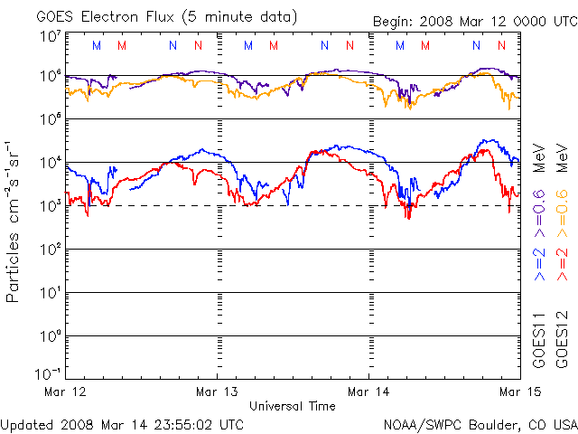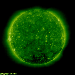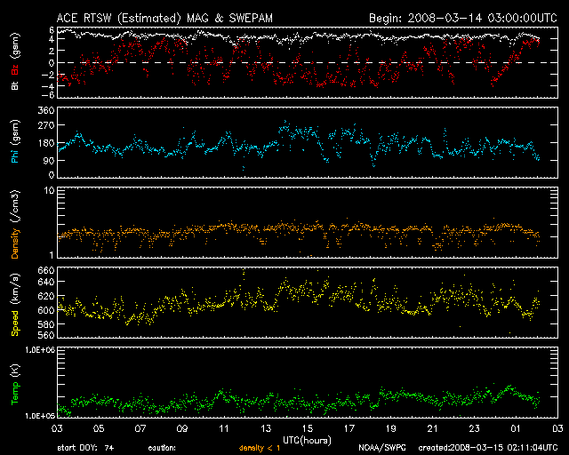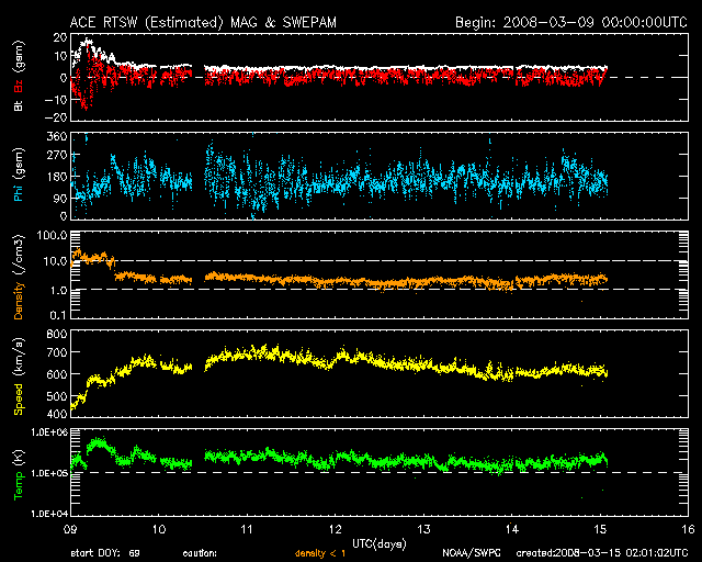 2008/ 3/15 11:12 更新 600km/秒の高速太陽風が続いています。オーロラ活動も活発に続いています。 担当 篠原 高速太陽風が元気に続いています。 昨日以降も、600km/秒と、比較的高い速度レベルで安定しています。 1枚目に掲載しているACEの1週間の図で、今回の高速風を振り返ってください。 図の始め(3月9日)に速度が上昇して以来、600km/秒台の強い風が一貫して続いています。 SOHO EIT195で太陽コロナを見ると、大きかったコロナホールは既に西側に去り、 現在、目立ったコロナホールは見えていません。 前周期も10日くらい高速風が続いていたので、それが回帰しているのだと思われますが、 今の高速風が太陽のどのあたりからやって来ているものなのか、 はっきりしないのも面白いところです。 太陽風磁場の南北成分が、南向きも含めて、細かく振れています。 このため、オーロラ活動も活発に続いています。 AE指数で、500〜1000nTくらいの中規模活動が半日ほど見られています。 シベリアの磁場データで見ると、昨日は活動の勢いがむしろ増した様にも見えます。 この高速風の今後ですが、 27日周期の図で前周期の様子を振り返ると、 今日、明日に少し下がって、それから2日ほど次の山が来るという変化が考えられます。 先に書いた様に、コロナホールがはっきり見えないので、 現在の太陽の写真から予想をするのは難しいです。 27日周期の図で、前回の繰り返しを見込んで予想をするしかなさそうです。 もうしばらく、速度の高い太陽風が続きそうです。 放射線帯高エネルギー電子は、高いレベルが続いています。 衛星の運用では注意が必要です。 太陽はとても静穏です。 黒点は見られません。 ACE衛星による1週間の太陽風データ。高速太陽風がずっと続いている。 (c) NOAA/SWPC ![]() SOHO衛星のEIT195カメラの映像 (c) SOHO (ESA & NASA)