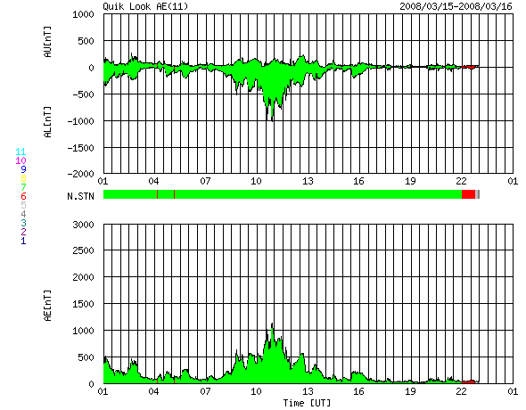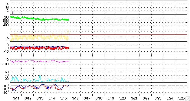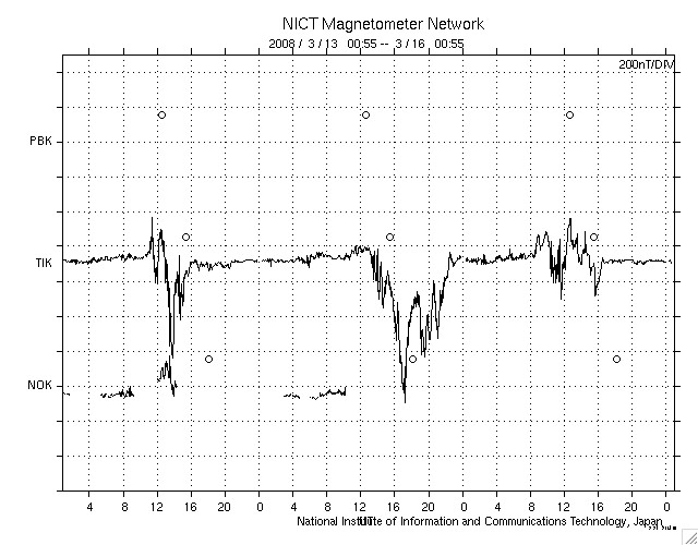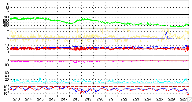 ACEが観測した太陽風の磁場(1番上の枠、白線は全体の強度、赤線は南北成分) および、太陽風の密度(3番目の橙線)、速度(4番目の黄線) (c) NOAA/SWPC ![]() リアルタイムAE指数 下段のAEグラフの値が高くなると、オーロラ活動が活発化しています。 (c) 京都大学, NICT ![]() シベリアで観測された3日間の磁場データ 右側の3分の1が、昨日のデータになります。グラフが上がったり下がったりすると、オーロラ活動が活発化しています。 (c) NICT ![]() 27日の太陽周期に合わせたデータプロット 太陽が同じ面を地球に向けていた27日前の変化から、今後を予想することができます。 (c) NICT