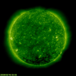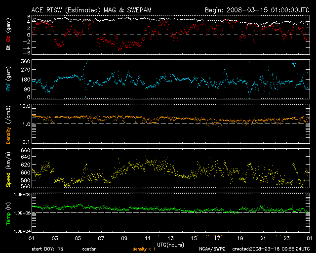 2008/ 3/16 09:56 更新 600km/秒の高速太陽風が続いています。太陽の南半球側に、新しい周期の磁場分布が見えています。 担当 篠原 600km/秒前後の高い速度の太陽風が続いています。 ACEの図の最後のところで、580km/秒に下がりつつある様に見えますが、 依然、安定した高速風です。 SOHO EIT195では、コロナホールらしい領域は南極方面にしか見られないのですが、 現在の高速風は、緯度の高いこの領域からの影響なのでしょうか。 27日周期通りに進むとすると、もう3〜4日くらい高速風が続く可能性があります。 活発なオーロラ活動も続いています。 AE指数では、1000nTに達する大きな中規模活動がひとつ、図のまん中に見えています。 図の後半は、すっかり静かになっていますが、 これは、太陽風磁場が北寄りになったためです。 ACEの図で言うと、赤線がプラス側に偏っているためです。 (ACEの図の前半は、これがマイナス側にあり、このため大きなオーロラが起きました) もうしばらく高速風が続くとすると、 今後も太陽風磁場の南向きによって、活発なオーロラが見られるでしょう。 放射線帯の高エネルギー電子は、警戒レベルを保っています。 オーロラ活動の影響か、昨日よりは下がっています。 明日はどうなるでしょうか。 太陽は無黒点で静穏です。 SOHO EIT195の東端(左端)を見ると、 赤道近くと、南半球の中緯度側に小さく明るい領域が見えます。 可視光写真を見ると、黒点にはなっていない様です。 この南側の明るいところの磁場が、微かですが[ 黒 白 ]と並んでいます。 これは、新しい活動周期の磁場分布です。 南半球側では、初登場ではないでしょうか。 SOHOによる、太陽面の磁場分布。南東(左下)に、かすかに[黒白]と並んだ領域が見えます。第24期の順番です。 (c) SOHO (ESA & NASA) ![]() SOHO衛星のEIT195カメラの映像 (c) SOHO (ESA & NASA)