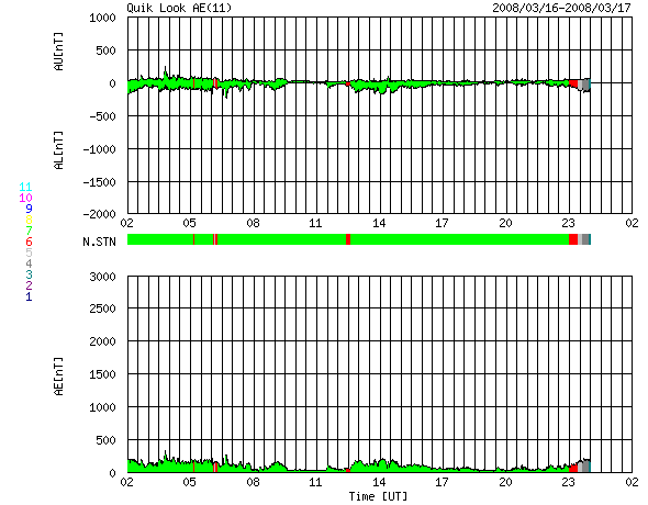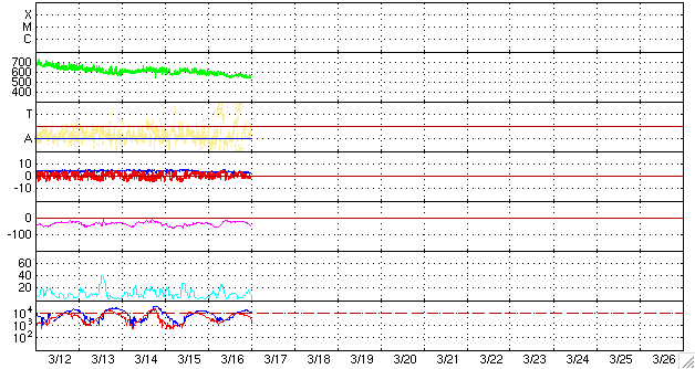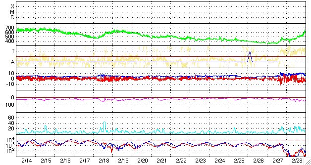 ACEが観測した太陽風の磁場(1番上の枠、白線は全体の強度、赤線は南北成分) および、太陽風の密度(3番目の橙線)、速度(4番目の黄線) (c) NOAA/SWPC ![]() リアルタイムAE指数 下段のAEグラフの値が高くなると、オーロラ活動が活発化しています。 (c) 京都大学, NICT ![]() シベリアで観測された3日間の磁場データ 右側の3分の1が、昨日のデータになります。グラフが上がったり下がったりすると、オーロラ活動が活発化しています。 (c) NICT ![]() 27日の太陽周期に合わせたデータプロット 太陽が同じ面を地球に向けていた27日前の変化から、今後を予想することができます。 (c) NICT
