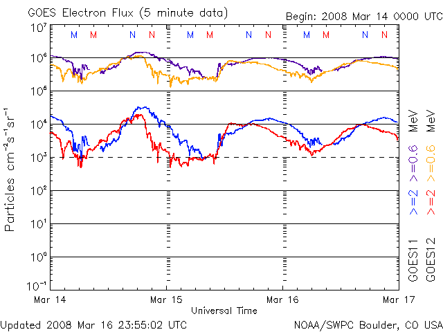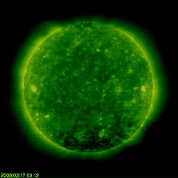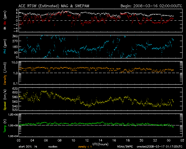 2008/ 3/17 10:18 更新 高速風領域の速度が下がり始めました(550km/秒)。放射線帯は強まったままです。 担当 篠原 太陽風の速度が、ゆっくりと下がり始めています。 昨日の1日で、600km/秒から、550km/秒に落ちています。 普通の高速風になったというところでしょうか。 磁場の強度も、4nTから2nT近くに下がっています。 磁場強度が弱まったということで、高速太陽風の領域は終わりに近づいている様です。 3月9日以来、8日間にわたって、地球は速度の高い太陽風の中を通っていますが、 もう2〜3日くらいで、そこから抜け出すことになりそうです。 昨日のオーロラ活動は、だいぶ穏やかでした。 AE指数では、200nTくらいの小さな変化しか見えていません。 これは、速度、磁場強度が下がって来たことと、 磁場の南北成分(ACEの赤線)があまり南(マイナス)を向かなかったことの ふたつが原因でしょう。 シベリア磁場データで3日間の変化を見ると、 日を追うごとに変化の幅が小さくなっています。 オーロラの規模が次第に弱まっていることを示しています。 高速風が弱まって来ていますから、今後は、目立ったオーロラ活動は起こりにくくなります。 高速風が終わると、その後は1週間くらい静穏な日が続くでしょう。 27日周期の図で、2月21〜26日が1周期前の変化に当たります。 放射線帯高エネルギー電子は、高いレベルを保っています。 太陽風が静かになると、放射線帯の減少はとてもゆっくりになります。 今後も数日間にわたって、警戒状態が続くでしょう。 太陽では、986黒点群がとても小さな姿を見せています。 太陽の西の端(右端)近くです。 いつもの写真ではちょっと見にくいので、 1枚めにもう少し見やすい写真を掲載します(同じSOHOの写真ですが)。 どこにあるか分かりますか? SOHO MDIカメラによる、17日6時(世界時16日21時)の太陽。西の端に小さな黒点が見えています。 (c) SOHO (ESA & NASA) ![]() SOHO衛星のEIT195カメラの映像 (c) SOHO (ESA & NASA)