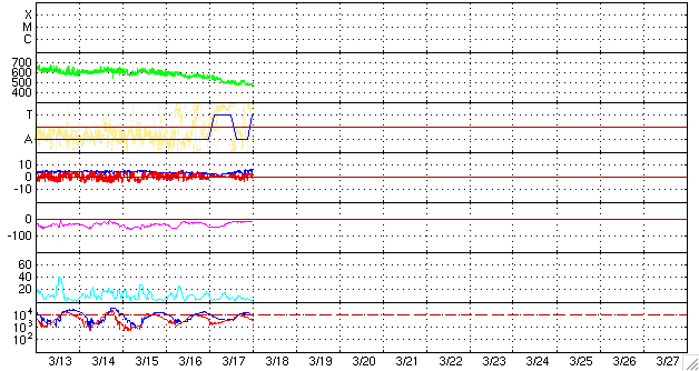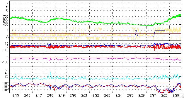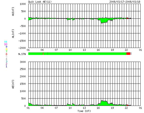 ACEが観測した太陽風の磁場(1番上の枠、白線は全体の強度、赤線は南北成分) および、太陽風の密度(3番目の橙線)、速度(4番目の黄線) (c) NOAA/SWPC ![]() リアルタイムAE指数 下段のAEグラフの値が高くなると、オーロラ活動が活発化しています。 (c) 京都大学, NICT ![]() シベリアで観測された3日間の磁場データ 右側の3分の1が、昨日のデータになります。グラフが上がったり下がったりすると、オーロラ活動が活発化しています。 (c) NICT ![]() 27日の太陽周期に合わせたデータプロット 太陽が同じ面を地球に向けていた27日前の変化から、今後を予想することができます。 (c) NICT