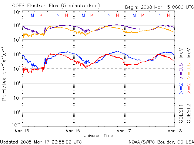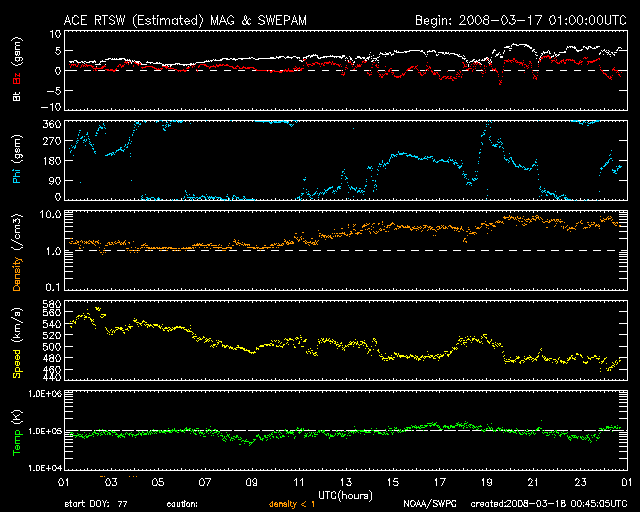 2008/ 3/18 09:43 更新 太陽風の速度は460km/秒に下がり、地球は高速風領域を抜け出した様です。 担当 篠原 太陽風の速度(ACEの黄色線)は下がり続け、現在は460km/秒です。 地球は高速風領域を抜け出し、太陽風は普段の状態に戻りつつあります。 磁場強度(白線)、密度(橙色線)を見ると、この半日ほどやや強まる方向に向かっています。 磁場強度は5nT、密度は10個/cm^3近くまで上がっています。 たいした変化ではありませんが、前周期(27日周期の図を参照)の2月18日頃に見られた様な、 太陽風速度の小さな盛り上がりがやって来たりするのでしょうか。 高速風が終わるとともに、磁気圏のオーロラ活動はすっかり弱まっています。 AE指数では、300nTの小規模の変化がぽつんとひとつあるだけで、他はほとんど平坦です。 この後も、オーロラ活動は基本的には穏やかでしょう。 さて、この10日間ほど活発だった宇宙天気も一段落着いて、 これから1週間ほど静かな期間が続きます。 太陽風の速度は400km/秒台で推移し、磁気圏も概ね静穏でしょう。 次の太陽風の乱れは、3月25-26日頃からと予想されます。 27日周期の図では、2月27-28日から始まる変化です。 まだ少し先のことなので、掲載の27日周期の図では、やっと始まりが見えている程度です。 発生源のコロナホールも、もう2-3日しないと見えて来ません。 放射線帯の高エネルギー電子は、高いレベルを保っています。 昨日から強さはほとんど変わっていません。 警戒状態が続いています。 太陽では、986黒点群は消えた様です。 X線のグラフはとても静かです。 SOHO衛星のEIT195カメラの映像 (c) SOHO (ESA & NASA)