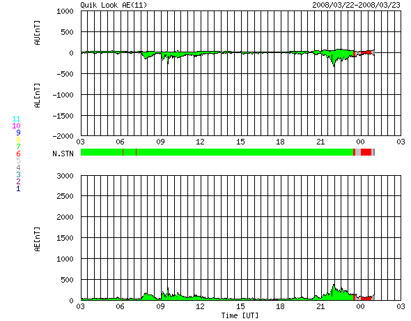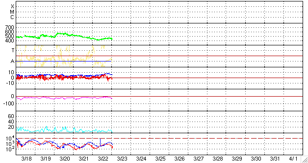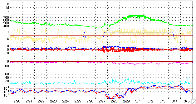 ACEが観測した太陽風の磁場(1番上の枠、白線は全体の強度、赤線は南北成分) および、太陽風の密度(3番目の橙線)、速度(4番目の黄線) (c) NOAA/SWPC ![]() リアルタイムAE指数 下段のAEグラフの値が高くなると、オーロラ活動が活発化しています。 (c) 京都大学, NICT ![]() シベリアで観測された3日間の磁場データ 右側の3分の1が、昨日のデータになります。グラフが上がったり下がったりすると、オーロラ活動が活発化しています。 (c) NICT ![]() 27日の太陽周期に合わせたデータプロット 太陽が同じ面を地球に向けていた27日前の変化から、今後を予想することができます。 (c) NICT