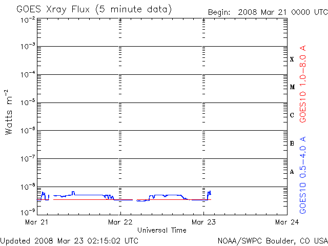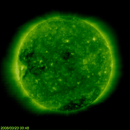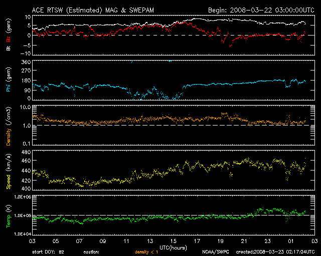 2008/ 3/23 11:18 更新 速度440km/秒の太陽風で、宇宙天気は穏やかです。 担当 篠原 400km/秒台中盤の太陽風が続いています。 落ち着きはしましたが、低速風になるほどではなさそうです。 磁場強度も、5nTから8nTくらいに強まったりして、 普通と言える範囲ですが、やや高めで安定しています。 磁気圏のオーロラ活動は、小さなものが発生している程度で、 かなり静かです。 シベリア磁場データで3日間の変化を見ると、どれも小さな変化ですが、 その中でも、一段と静かになっていることが読み取れます。 こんな感じで、25日まで、宇宙天気は基本的に穏やかに過ぎて行くでしょう。 そして、26日から次の太陽風の乱れがやってきます。 SOHO EIT195では、小さなコロナホールが、ちょうど太陽のまん中に来ています。 3日後に高速風開始というのは、妥当なところでしょう。 そのコロナホールから、東側に向かって次の大きなコロナホールが広がっています。 ここが太陽の中心に来るまで3日、それから風が地球に来るのに3日と見積もると、 高速風のピークは29日頃になりそうです。 27日周期の図で考えると、前回のピークの回帰は28日と見込まれます。 さて、実際にはどうなるでしょうか。 太陽は黒点はなく、とても静かです。 SOHO衛星のEIT195カメラの映像 (c) SOHO (ESA & NASA)