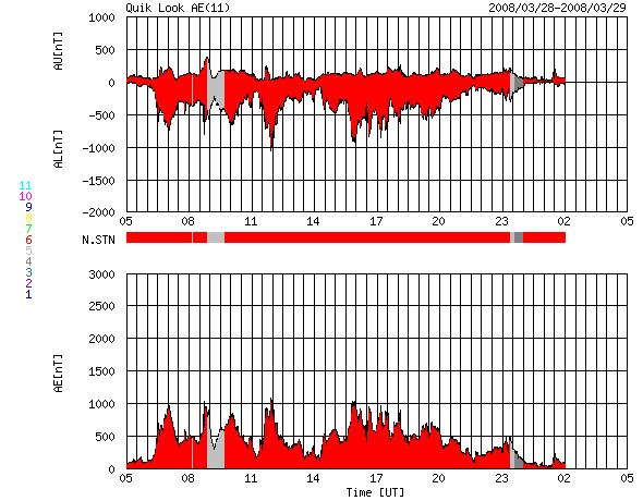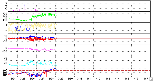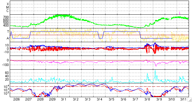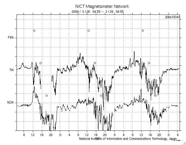 ACEが観測した太陽風の磁場(1番上の枠、白線は全体の強度、赤線は南北成分) および、太陽風の密度(3番目の橙線)、速度(4番目の黄線) (c) NOAA/SWPC ![]() リアルタイムAE指数 下段のAEグラフの値が高くなると、オーロラ活動が活発化しています。 (c) 京都大学, NICT ![]() シベリアで観測された3日間の磁場データ 右側の3分の1が、昨日のデータになります。グラフが上がったり下がったりすると、オーロラ活動が活発化しています。 (c) NICT ![]() 27日の太陽周期に合わせたデータプロット 太陽が同じ面を地球に向けていた27日前の変化から、今後を予想することができます。 (c) NICT