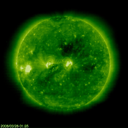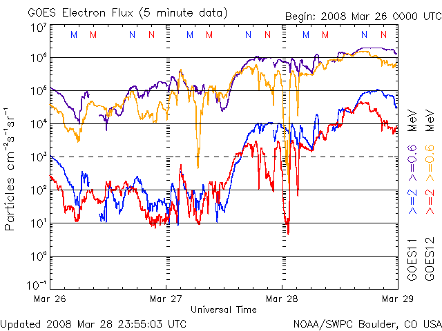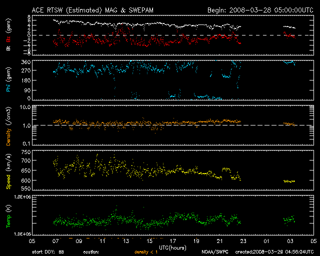 2008/ 3/29 13:57 更新 高速太陽風は後半を迎えています。放射線帯が100,000に達しています。かなり強まっており、注意が必要です。 担当 篠原 高速の太陽風領域は、ピークを迎えた様です。 昨日は、600km/秒と700km/秒の間を細かく変化していましたが、 やがて600km/秒に下がっています。 太陽風磁場の強度も、ゆっくりと弱まって、3nTに近づいています。 このことからも、高速風は後半に入ったと考えられます。 27日周期の図で、前周期の変化と比較してください。 高速風が最高速に達したタイミングはほぼ同じでした。 しかし、速度としては、前回は800km/秒まで上がったのですが、 今回は700km/秒止まりでした。 コロナホールとしては、少し広がったようにも見えていたのですが、 黒点群が発達したことが、高速風の噴き出しに影響したのでしょうか。 太陽風は引き続きゆっくりと速度を下げて行くでしょう。 明後日くらいには、普通の風に戻ると予想されます。 磁気圏のオーロラ活動は、活発に続いていました。 これは、太陽風磁場の南北成分が、南向きで推移していることが大きく関係しています。 AE指数では、1000nTに達する活発な変化が、頻繁に見られています。 シベリア磁場データを見ると、毎日、磁気圏が活発に活動を続けていたことがよく分かります。 しかし、このにぎやかさもそろそろ終わりを迎えそうです。 太陽風のデータに戻ると、速度はまだ600km/秒とかなり高速なのですが、 磁場強度がだいぶ弱まっています。 こうなると、南を向いても、変化の幅は小さくなってしまいます。 オーロラの強さは、太陽風の速度と南向き磁場の大きさに関係しています。 高速風は後半に入ったと書きましたが、 オーロラ活動も同様に、今日以降はすっかり弱まってしまいそうです。 高速太陽風の影響が、もうひとつ磁気圏で起こっています。 放射線帯の高エネルギー電子の急増です。 昨日警戒レベルに達したと書きましたが、その後も大きく増加が続き、 GOES 11(青線)が、100,000に達しています。 ここまでの上昇は、そう簡単には起こりません。 100,000を超えるのは、2005年9月以来です。 放射線帯がかなり強まっていますので、衛星の運用では注意が必要です。 太陽は、黒点群は3つ見えていますが、活動度は低く、 静穏な状態が続いています。 このまま静かに過ぎて行きそうです。 SOHO衛星のEIT195カメラの映像 (c) SOHO (ESA & NASA)