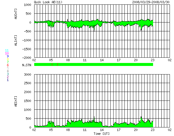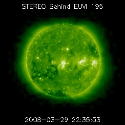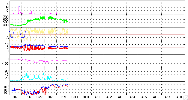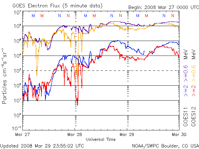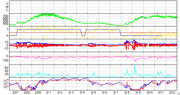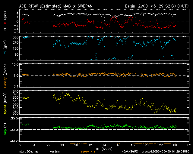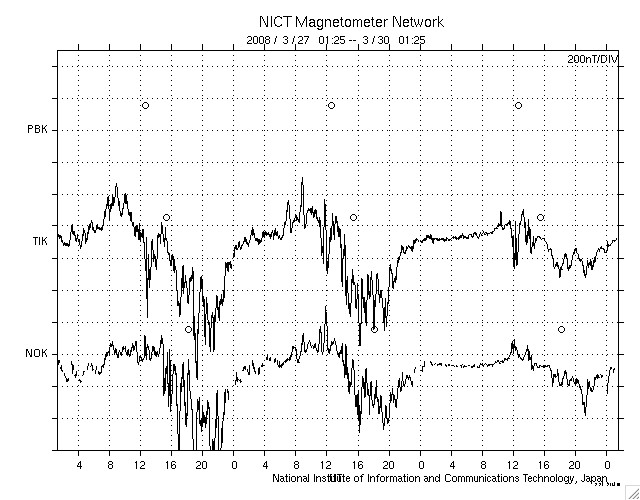 2008/ 3/30 10:30 更新 太陽風の速度はゆっくりと下がっています。放射線帯が強まった状態は続いています。 担当 篠原 太陽風の速度がじりじりと下がっています。 間もなく、500km/秒を割りそうな様子です。 27日周期の図を見ると、今回の高速風は、前回よりも山が低くなっただけで、 高速風の場所はほとんど変化がありませんでした。 このまま今日も速度が下がり続け、明日には普通の太陽風に戻りそうです。 太陽風の磁場も強度が3nTと弱まっています。 しかし、南北成分を見ると、-2〜-3nTの南向きがずっと続いています。 磁場強度が弱まっている中で、効率よく南を向いている感じです。 このため、オーロラ活動も継続して発生しています。 発生規模はAE指数で400nTくらいと小規模ですが、一日中続いています。 シベリア磁場データを見てください。 3日間で見ると、変化の振れが次第に小さくなっていることが分かります。 活動の規模が小さくなっているのは、 磁場が弱まっていることと、速度が下がっていることの両方が効いています。 明日以降、太陽風は一旦静穏に戻ります。 そして、4日ほど経つと、次の高速風がやって来ます。 その発生源のコロナホールが、STEREOの写真で見えています。 STEREO Behindは、位置の関係で、地球にとって1日ほど先の太陽を見ています。 この写真で、コロナホールの先頭がもうすぐ太陽の中心に達するところです。 すると、地球への影響は5-6日ほど先、4月4-5日くらいからになるのではないでしょうか この見込みは、27日周期の図ともだいたい一致します。 放射線帯の高エネルギー電子は、たいへん高いレベルを保っています。 昨日は100,000の線には達しませんでしたが、 たいへん強まっていることは変わっていません。 この状態は数日に渡って続きます。 衛星の運用ではしばらく注意が必要でしょう。 太陽のフレア活動は静穏です。 黒点群は次第に規模が小さくなっている様です。 STEREO衛星が撮影した、太陽コロナの写真。東側にコロナホールが広がっています。 (c) NASA ![]() ACEが観測した太陽風の磁場(1番上の枠、白線は全体の強度、赤線は南北成分) および、太陽風の密度(3番目の橙線)、速度(4番目の黄線) (c) NOAA/SWPC ![]() リアルタイムAE指数 下段のAEグラフの値が高くなると、オーロラ活動が活発化しています。 (c) 京都大学, NICT ![]() シベリアで観測された3日間の磁場データ 右側の3分の1が、昨日のデータになります。グラフが上がったり下がったりすると、オーロラ活動が活発化しています。 (c) NICT ![]() 27日の太陽周期に合わせたデータプロット 太陽が同じ面を地球に向けていた27日前の変化から、今後を予想することができます。 (c) NICT