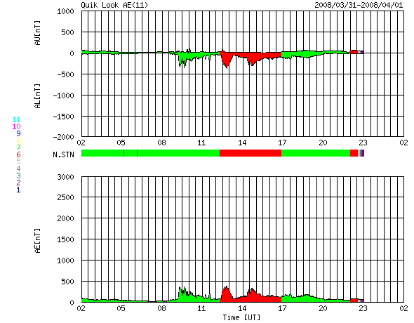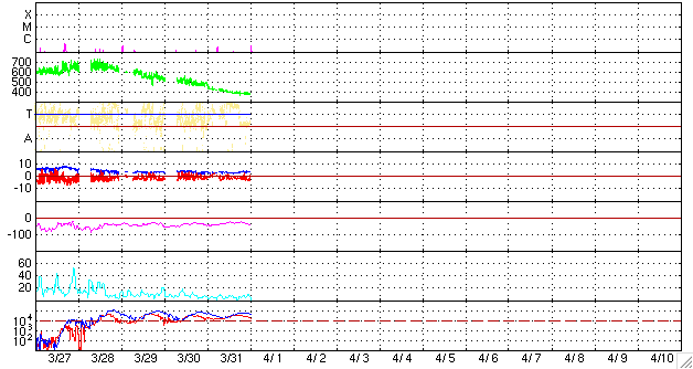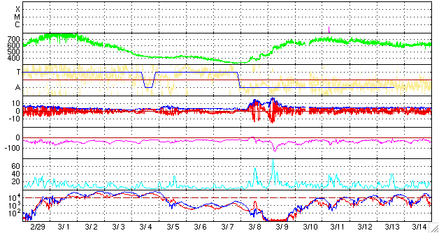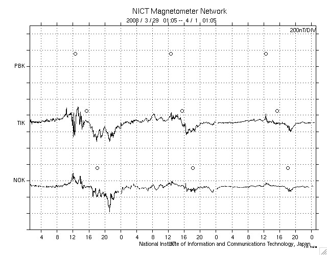 ACEが観測した太陽風の磁場(1番上の枠、白線は全体の強度、赤線は南北成分) および、太陽風の密度(3番目の橙線)、速度(4番目の黄線) (c) NOAA/SWPC ![]() リアルタイムAE指数 下段のAEグラフの値が高くなると、オーロラ活動が活発化しています。 (c) 京都大学, NICT ![]() シベリアで観測された3日間の磁場データ 右側の3分の1が、昨日のデータになります。グラフが上がったり下がったりすると、オーロラ活動が活発化しています。 (c) NICT ![]() 27日の太陽周期に合わせたデータプロット 太陽が同じ面を地球に向けていた27日前の変化から、今後を予想することができます。 (c) NICT