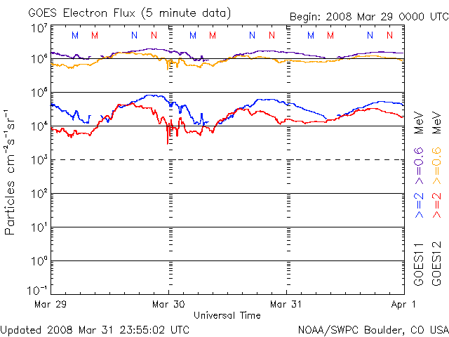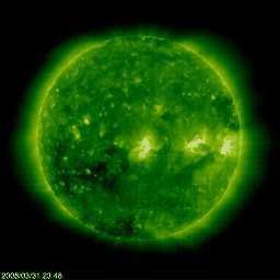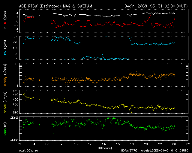 2008/ 4/ 1 10:02 更新 穏やかな太陽風で(380km/秒)、磁気圏も概ね静穏です。放射線帯は強まったままです。 担当 篠原 太陽風の速度は順調に下がり続け、昨夜のうちに380km/秒と普通の速度に戻りました。 そこまで下がった所で、安定状態に入っています。 磁場強度は4nTで落ち着いています。 南北成分は、-2nTと弱いながら南向きがずっと続いています。 しかし、速度がすっかり下がってしまったので、磁気圏への影響は小さくなっています。 AE指数では、300nTくらいの小さな変化がちらちらと見えている程度です。 昨日の図と見比べても、活動が一段弱まった印象があります。 その傾向は、シベリアの磁場変化を見てもよく分かります。 この図の磁場変化の大きさから、 シベリアでどの程度のオーロラ活動が発生していたかを知ることができます。 3日前(左側)、2日前(まん中)、昨日(右側)と、変化の幅が順に小さくなっています。 オーロラの活動が次第に小さくなったことを表しています。 さて、今日はSOHOのEIT 195の写真を掲載しています。 コロナホール(周囲よりも暗く見えている領域)が、 太陽の東側(左側)から中央部へ広がって来ています。 昨日のSTEREOの写真と見比べて下さい。 コロナホールの位置は、むしろ東側に戻ったように見えます。 地球から見る太陽と、STEREO Behindから見る太陽とでは、1日半程度のずれがあります。 2枚の写真を見比べると、その差がよく分かります。 このコロナホールからの高速太陽風は、4日後の4月5日くらいからやって来るでしょう。 放射線帯高エネルギー電子は、強まった状態が続いています。 衛星の運用では注意が必要な状態が続いています。 太陽を見ると、989黒点群はほとんど見つけられなくなっています。 987, 988黒点群も次第に小さくなっていて、にぎやかだった太陽がまた寂しくなりそうです。 フレア活動も、Bクラスの小さな変化が見られるだけで、目立った活動は起きていません。 静かな太陽が続いています。 SOHO衛星のEIT195カメラの映像 (c) SOHO (ESA & NASA)